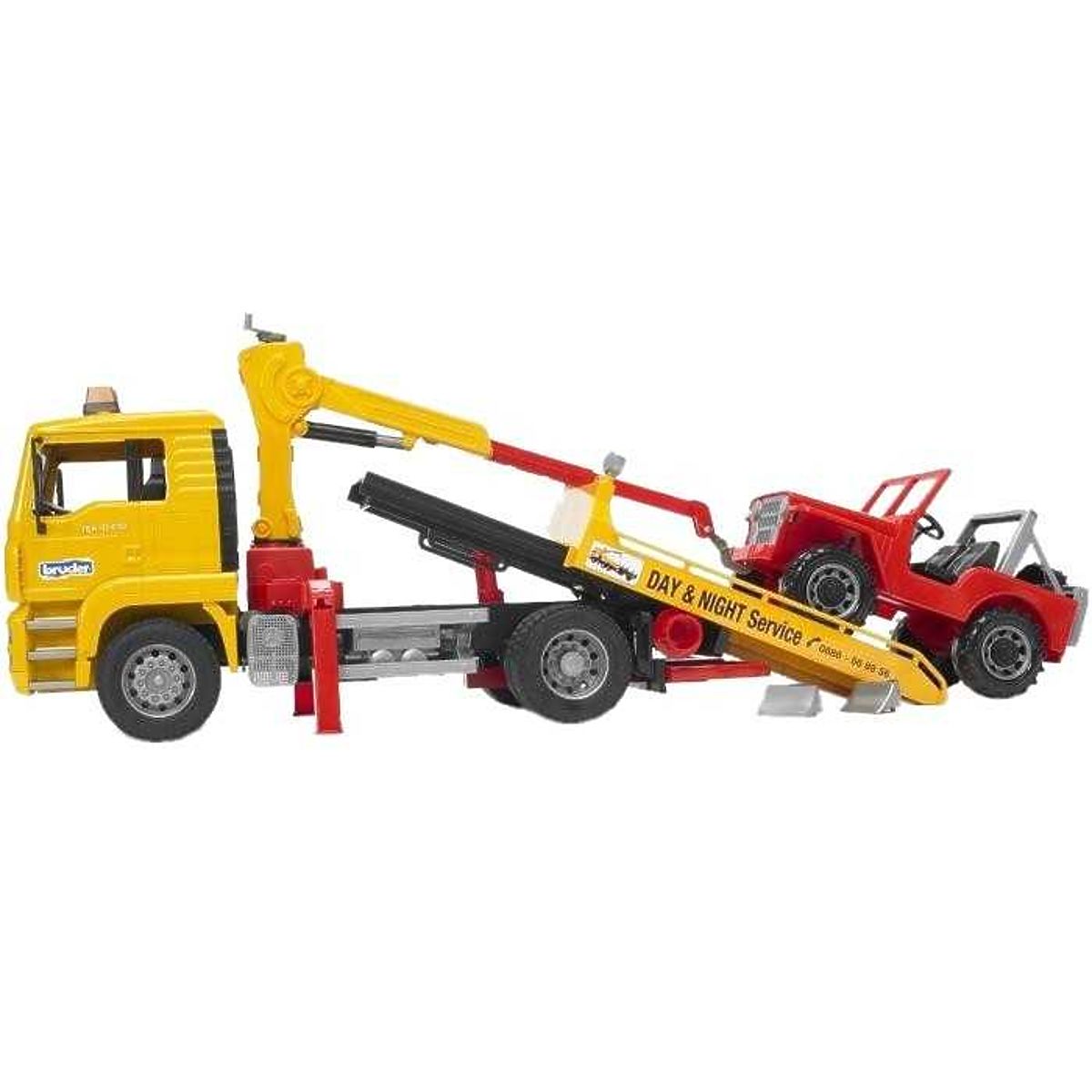 Camion de remorcare Bruder MAN + Jeep Serviciul de remorcare + Jeep este un camion de remorcare inclusiv un jeep. Camionul de remorcare MAN TGA are o cabină rabatabilă, permițând vizualizarea blocului motorului și un parbriz fabricat din policarbonat extrem de rezistent și indestructibil. În spatele cabinei se află un braț de manipulare rotativ funcțional, care poate fi extins și este echipat cu lanțuri și segmente de prindere pentru o manipulare ușoară a jeepului. Suprastructura are pene de sprijin și suporturi rabatabile pentru o stabilitate de 100% a camionului de remorcare complet încărcat. Jeep-ul off-road are capota motorului deschizabilă, partea frontală poate fi rabatată și are o direcție axială foarte simplă. La camionul de remorcare se pot achiziționa și instala un far și un semnal sonor (BR2801) și, de asemenea, o lamă frontală (BR2775). Fabricat în Germania, din materiale de calitate. Principalele caracteristici: camion cu Jeep cabină rabatabilă capotă motor deschizabilă partea frontală rabatabilă braț de manipulare rotativ fabricat în Germania