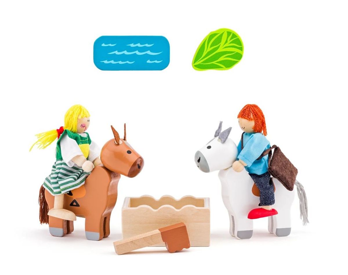 • include două figurine din lemn de cai și doi îngrijitori flexibili