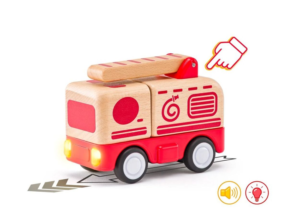 Noua colecție de vehicule marca Woody sunt mașinuțe adaptate ca dimensiune pentru mâinile mici. Fabricate din lemn cu elemente din plastic, vopsite cu culori sigure pentru copii. Au anvelope moi din cauciuc, ceea ce le conferă o bună aderență la suprafață. La apăsarea mașinuței, se aprind luminile, auzim semnalul și vehiculul începe să se miște.