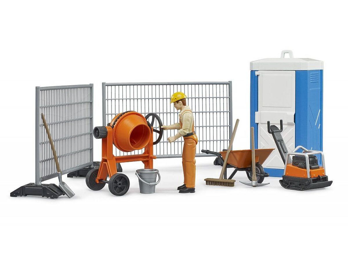Această set tematic permite micilor muncitori în construcții să recreeze realist o gamă largă de scene pe șantier. Gardurile de construcție asigură delimitarea spațiului șantierului. Setul include, de asemenea, o placă vibratoare și un mixer de mortar pentru lucrările de construcție. Desigur, este inclusă și o toaletă mobilă pentru nevoile personale ale muncitorului în construcții. Setul de construcție bworld este potrivit în special ca extensie pentru vehiculul MB Sprinter (Bruder 2677), mini-excavatorul Cat (Bruder 2466) sau tractorul cu încărcător frontal JCB MIDI (Bruder 2427). Principalele caracteristici: scară: 1:16, înălțimea figurinei: 10,7 cm, procesare de calitate și detalii, fabricat în Germania.