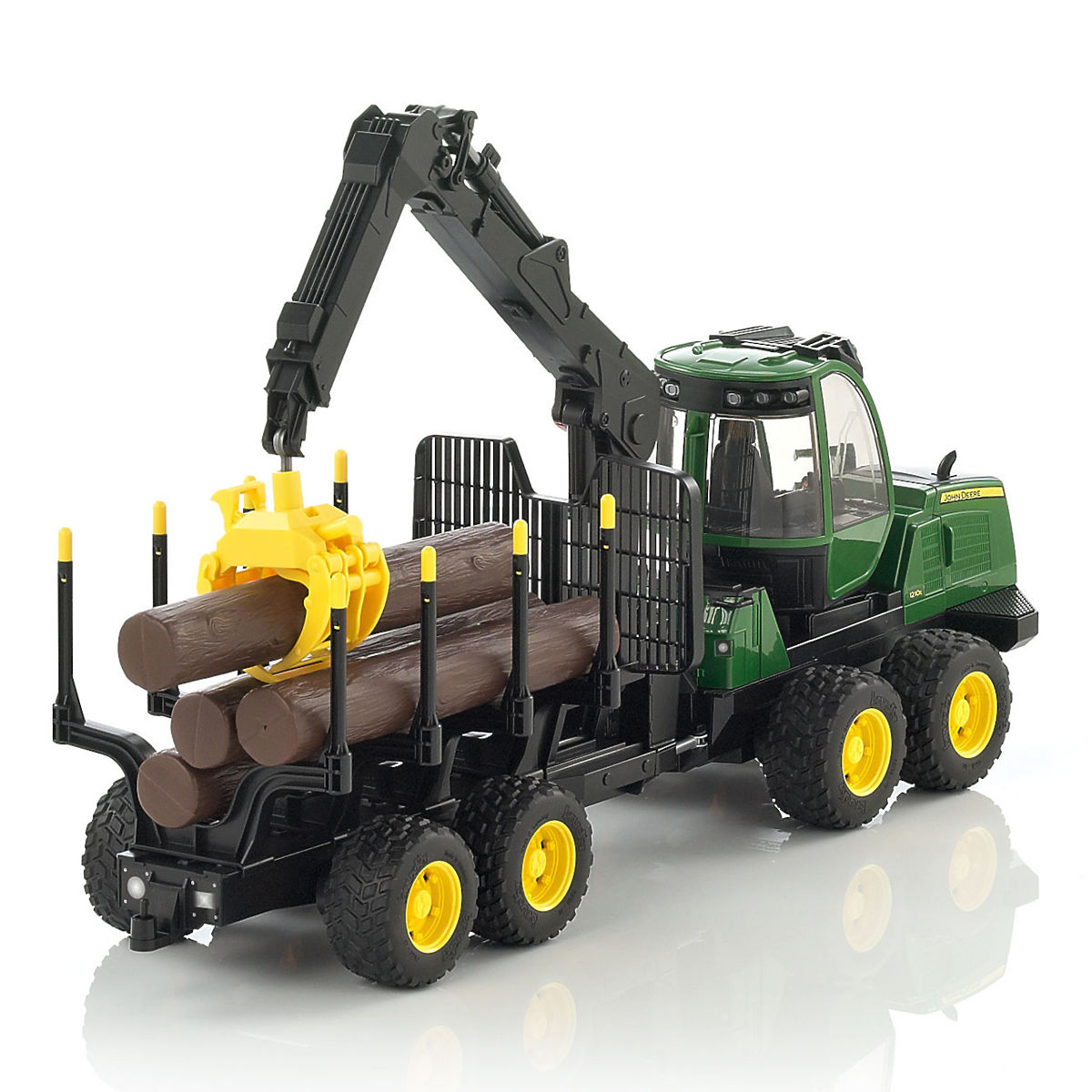 Tractorul forestier JOHN DEERE 1210E cu remorcă și braț de încărcare are uși și capotă de motor care se deschid. Cabina este rotativă la 360° și este realizată din policarbonat de înaltă calitate și rezistent la spargere. Încărcătorul funcțional cu gheară pentru încărcarea lemnului este, de asemenea, rotativ la 360°. De asemenea, are stâlpi glisanți, patru axe oscilante pentru a urma terenul forestier dificil. Tractorul forestier are la capăt un alt dispozitiv de cuplare pentru conectarea unei alte remorci. Vehiculul include 4 bușteni. Fabricat în Germania, din materiale de calitate. Caracteristici principale: uși și capotă care se deschid, cabină și gheară rotative la 360°, patru axe, dispozitiv de cuplare, 4 bușteni, fabricat în Germania