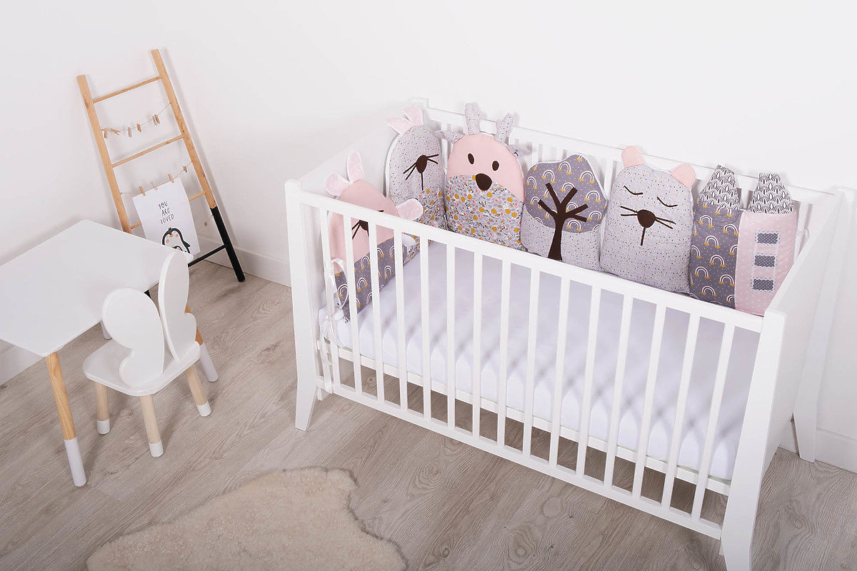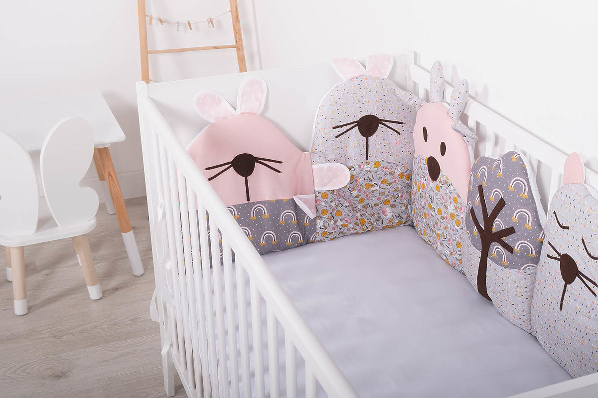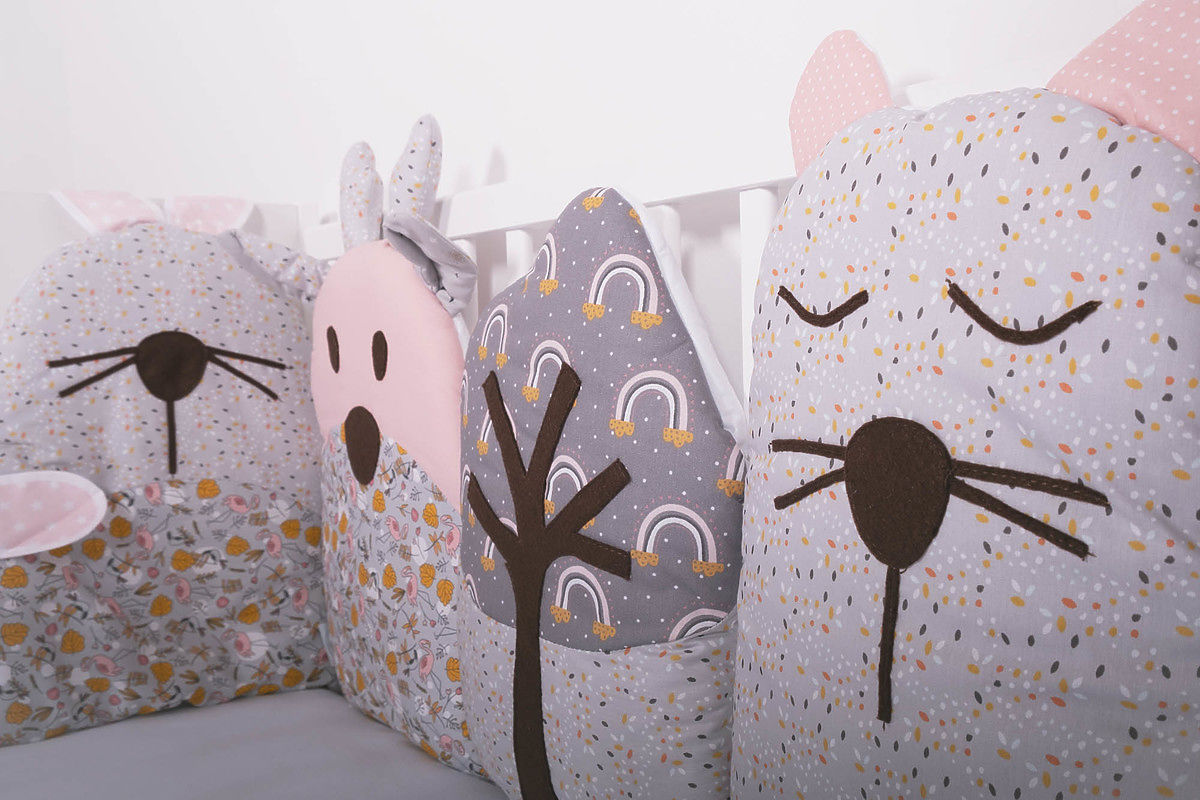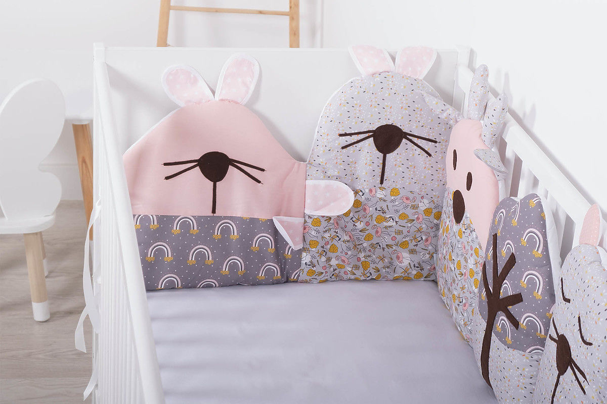 Frumoasa mantinel modular in design gri-roz cu model floral este potrivita pentru patuturi de dimensiuni 120 x 60 cm si 140 x 70 cm. Fiecare parte individuală a mantinelului este un original cusut manual .