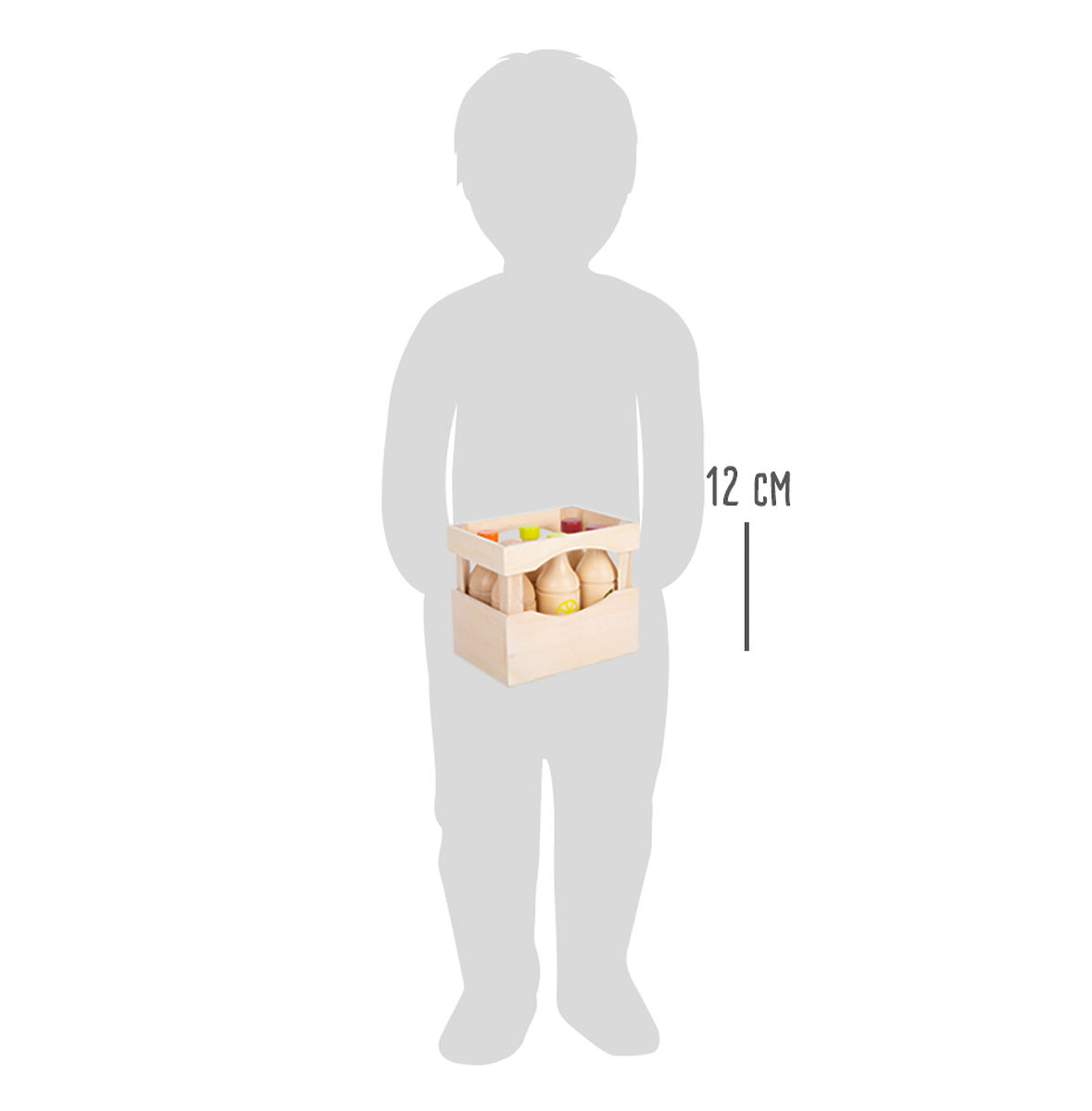 De pe raft în coșul de cumpărături! Această lădiță din lemn conține 6 sticle de băuturi din lemn. Veți găsi aici 2 sticle de limonadă de portocale, lămâie și cireșe. Sunt ideale pentru bucătăria sau standul de vânzare al copiilor. Datorită ilustrațiilor simple, chiar și cei mai mici copii vor înțelege jucăria. Lemnul solid garantează distracție de lungă durată. Principalele caracteristici: conține 6 sticle de băuturi, prelucrarea din lemn masiv garantează distracție de lungă durată, accesoriu pentru bucătăria sau standul de vânzare al copiilor