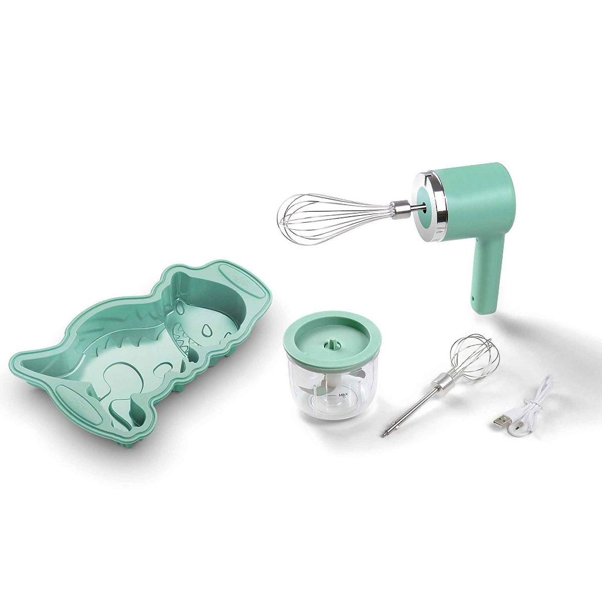 Copiii dvs. petrec cu plăcere timp în bucătărie și doresc să fie independenți? Cu acest set 3 în 1 pot fi. Setul de unelte pentru copt este perfect pentru micii bucătari. Include un mixer manual, un chopper (tocător) și o formă de copt din silicon. Fiecare element al acestui set a fost proiectat cu accent pe practicitate și ușurință în utilizare. Mixerul și chopperul sunt ușoare, astfel încât copiii le pot manevra fără probleme. Mixerul manual cu acumulator are 2 accesorii și 5 viteze. Chopperul (tocător) are un volum de 300 ml. Forma din silicon în formă de dinozaur este antiaderentă și flexibilă. Forma rezistă la temperaturi extreme: până la 230°C și -40°C, fiind astfel potrivită pentru cuptor și, de asemenea, pentru congelator. Dimensiunile formei sunt 27x17x6 cm, capacitate 950 ml. Fără BPA. Încărcare simplă cu ajutorul unui cablu USB. Cablul USB este inclus în pachet. Acest aparat poate fi folosit de copii, dacă sunt supravegheați de un adult sau au fost instruiți să-l folosească în siguranță și înțeleg posibilele pericole. Caracteristici principale: 3 în 1 într-un singur set, facilitează pregătirea diverselor feluri de mâncare, un ajutor excelent în bucătărie.