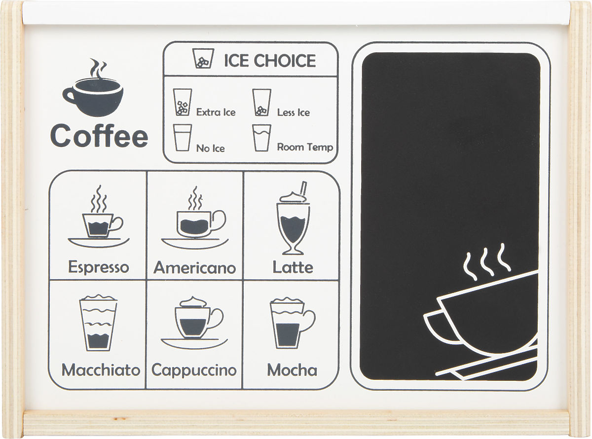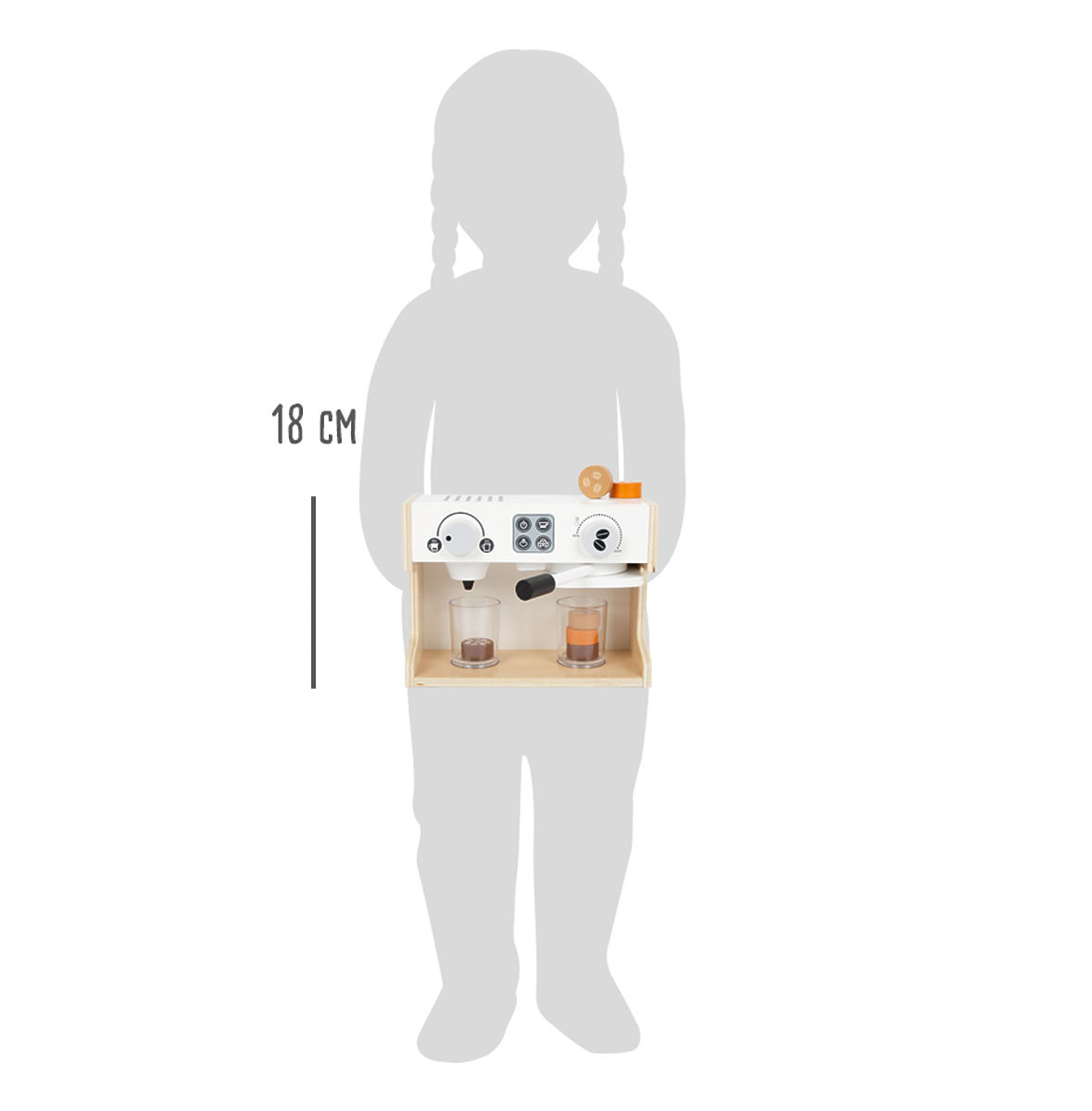 Avem aici niște tineri barista? Cu acest espressor profesional din lemn, poți prepara o cafea perfectă chiar și în bucătăria ta de jucărie. Două cadrane fac clic când sunt rotite, iar partea cu filtrul de cafea este rotativă. Poți prepara diferite tipuri de cafea. Pe partea din spate se află o tablă pe care poți scrie oferta ta zilnică. Espressorul modern cu spumator îți permite să bei cafea ca părinții! Jucăria susține dezvoltarea motricității și jocul de rol. Principalele caracteristici: butoane rotative care fac clic, tablă pentru cretă pentru oferta zilnică, susține jocul activ de rol, dezvoltarea motricității
