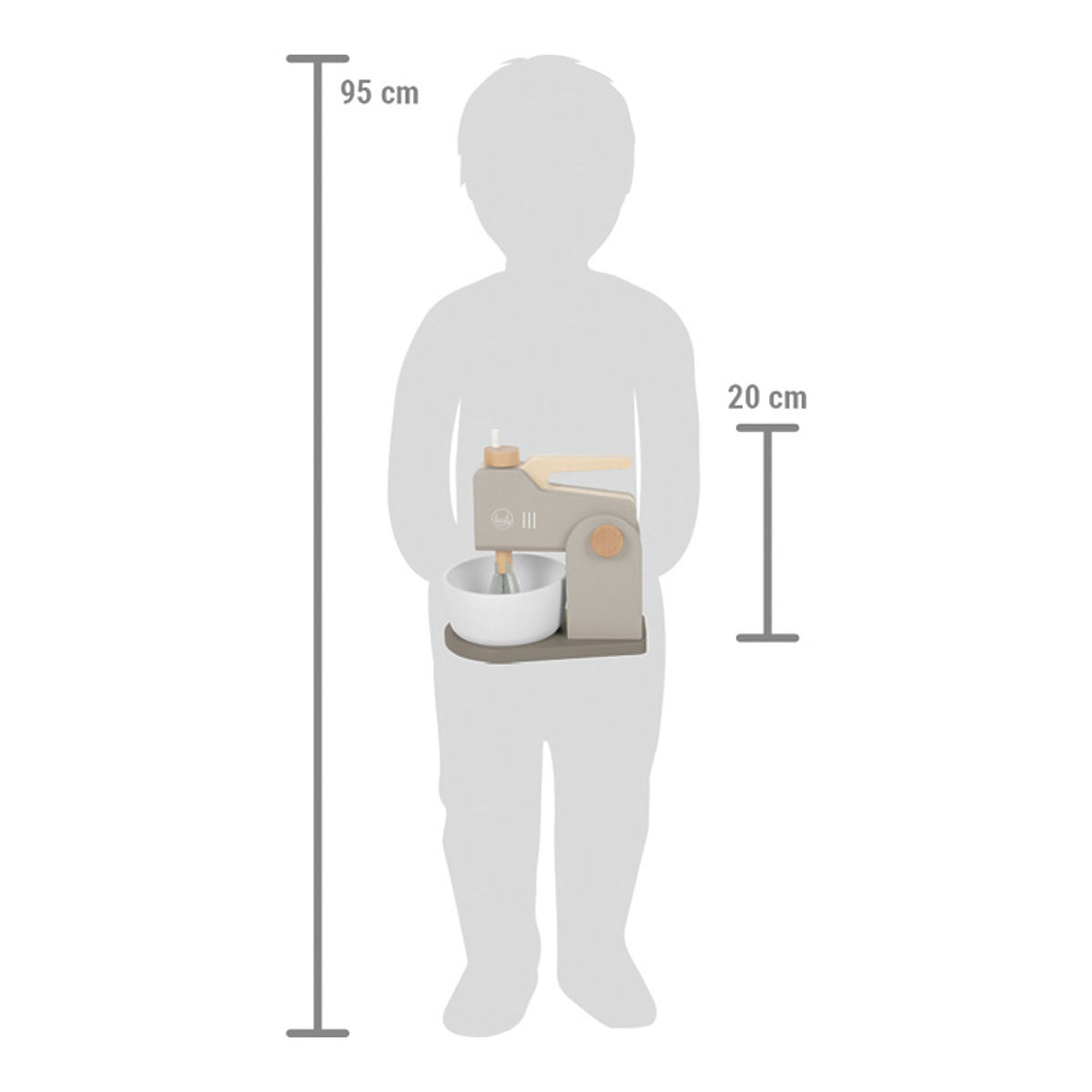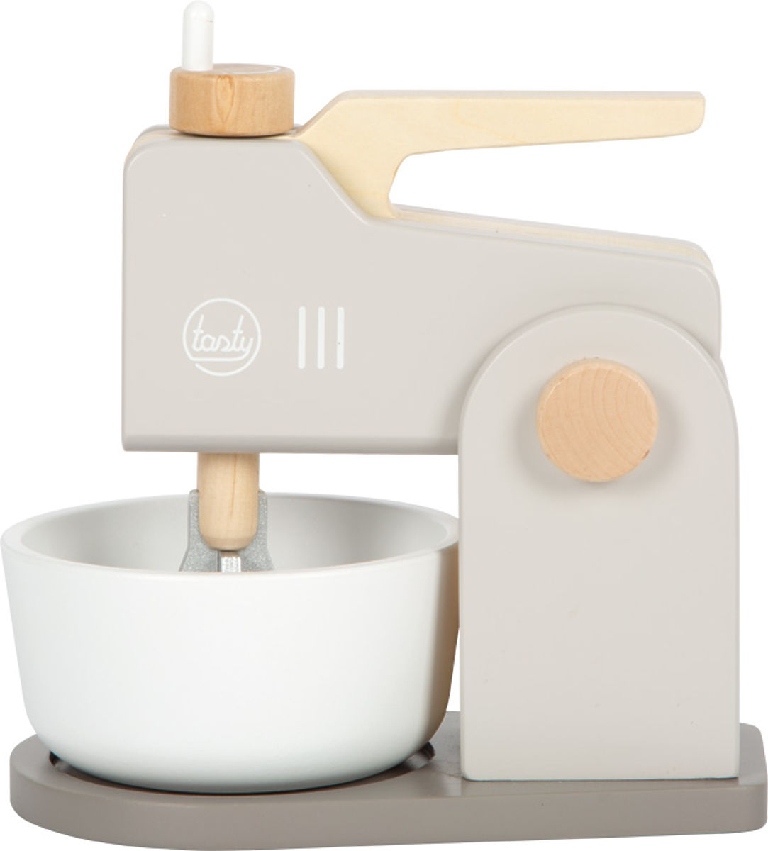 Cu acest set de mixer din lemn de culoare gri caldă, cu mult lemn natural, micii brutari și bucătărese vor fi echipați excelent în bucătăria lor. 2 în 1! Mixerul de mână poate fi atașat la baza mixerului și se transformă rapid într-un robot de bucătărie modern. Telul amplifică experiența de joc realistă, deoarece poate fi rotit cu ajutorul mânerelor. Desigur, nu lipsește nici bolul de lemn, în care trebuie amestecat aluatul potrivit. Capul mixerului rabatabil, care poate fi ridicat, permite scoaterea ușoară a bolului. Mixerul are o bază stabilă datorită suportului. Principalele caracteristici: 2 în 1, accesoriu ideal pentru bucătăriile copiilor, construcție stabilă, dezvoltarea abilităților sociale, design echilibrat și culori moderne, se potrivește cu alte produse din gama Tasty.