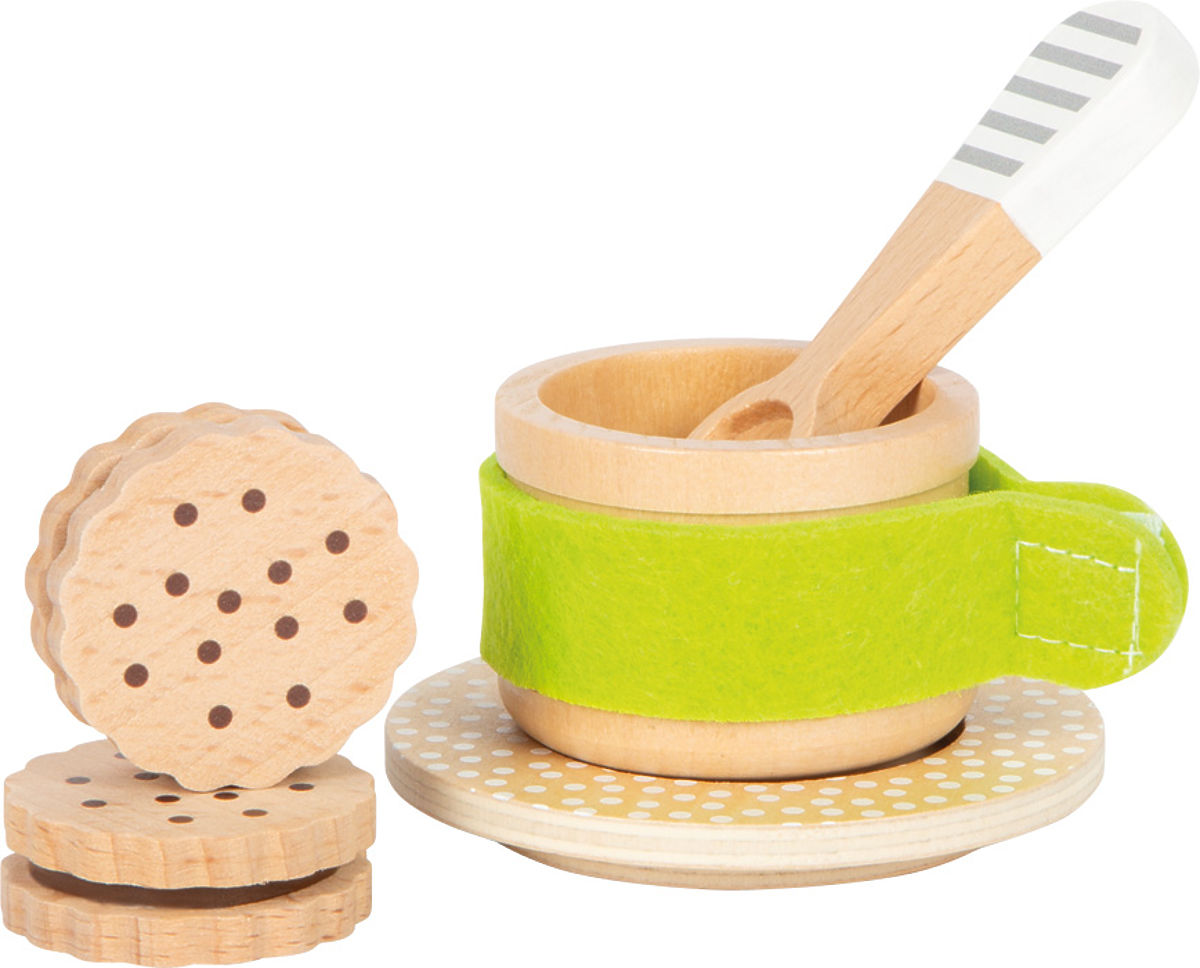 Atenție tuturor prietenilor ceaiului și iubitorilor de cafea. Acest set a fost conceput pentru cei mai mici gazde care adoră să imite adulții în pregătirea cafelei și ceaiului. Setul are un design frumos, detalii interesante, o cantitate mare de materiale din lemn și piese din fetru plăcute la atingere. Două cești cu farfurioare, două lingurițe, un recipient pentru zahăr, un vas pentru lapte și un ceainic mare pentru cafea/ceai sunt completate de o farfurie și biscuiți sandwich. Recipientul pentru zahăr și ceainicul pentru cafea/ceai au un capac detașabil pentru un joc și mai realist. Susține dezvoltarea imaginației și abilităților sociale. Principalele caracteristici: susține creativitatea și abilitățile sociale, fabricat din lemn și accesorii din fetru, un adaos excelent pentru bucătăria copiilor, piese din fetru plăcute la atingere.