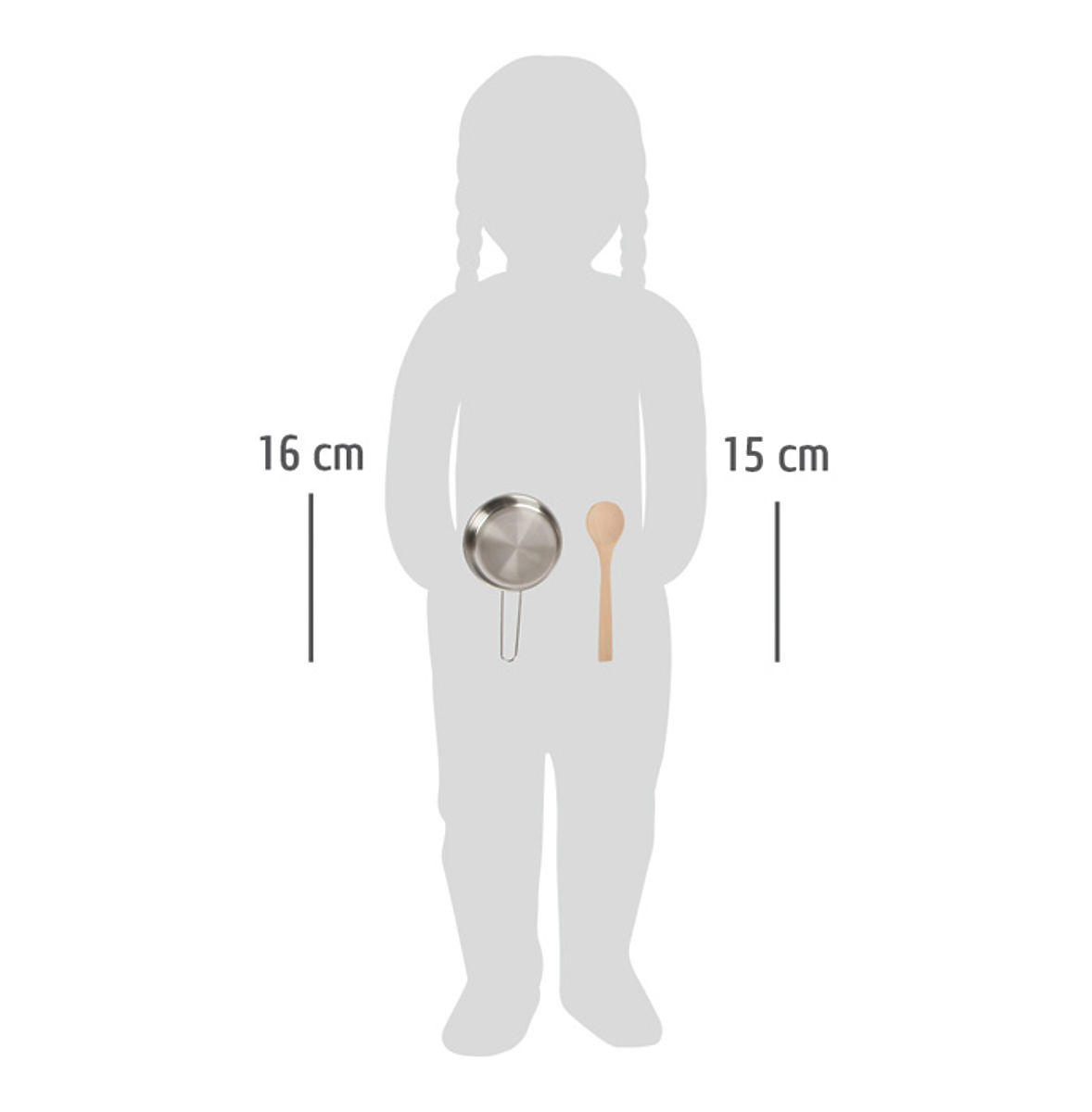 Setul extins de gătit este compus dintr-o oală cu capac, o tigaie, un tel, o spatulă și o lingură de lemn. În pachet se află și un șorț pentru copii, un suport pentru oală și o mănușă de bucătărie din material textil. Capac detașabil pentru oală pentru un joc realist. Vesela și ustensilele de bucătărie sunt de dimensiuni potrivite pentru copii. Șorțul are un buzunar mare la piept, unde se pot pune ustensilele de bucătărie. Un accesoriu ideal pentru bucătăria copiilor. Susține jocul de rol imaginativ. Caracteristici principale: Design la modăSusține imaginația copiilor