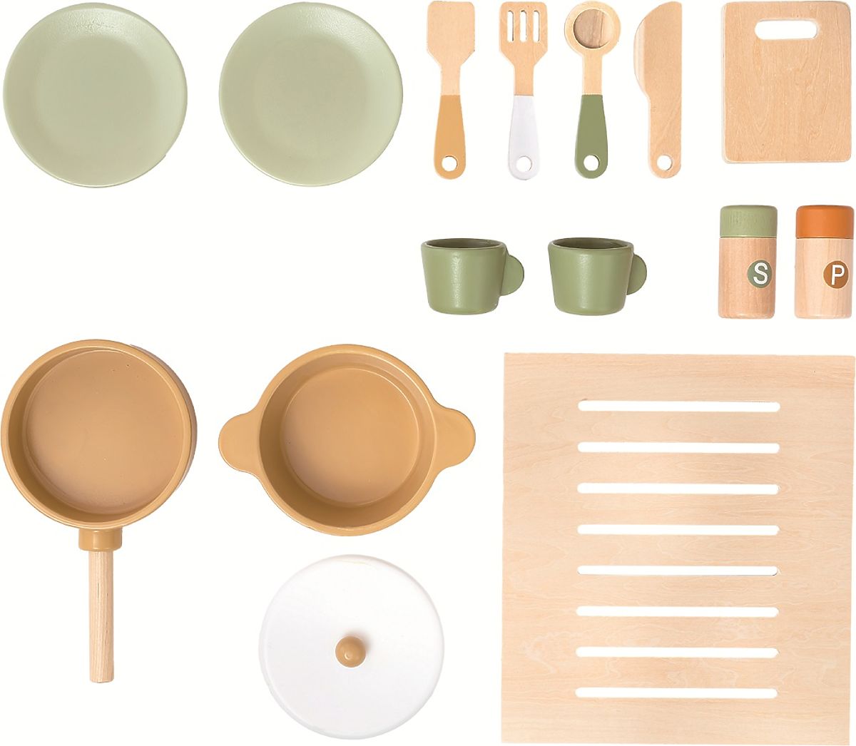 Doriți o prăjitură caldă de casă? Sau poate aveți poftă de ceva prăjit? Cu această bucătărie, puteți avea un meniu după dorințele dumneavoastră. Este complet echipată! Găsiți aici tot ce nu trebuie să lipsească dintr-o bucătărie modernă - aragaz cu cuptor, producător de gheață, cuptor cu microunde, chiuvetă, aparat de cafea și, bineînțeles, veselă și ustensile precum farfurii, oală, tigaie, căni, cuțit, polonic și altele. Datorită ușilor care se deschid și butoanelor rotative, plăcerea jocului este și mai realistă. Totul este realizat din lemn de calitate și tratat cu vopsele netoxice. Așadar, puneți-vă boneta de bucătar, îmbrăcați șorțul și începeți să gătiți! Conținutul pachetului: 2x farfurie, 2x cană, 1x tigaie, 1x oală, 1x capac, 1x recipient pentru piper, 1x solniță, 1x tocător, 4 bucăți de ustensile, grătar pentru cuptor. Principalele caracteristici: include accesorii bogate, multifuncțional, utilizare diversificată, dezvoltă abilități de comunicare și sociale, motivează la joc imaginativ, potrivit pentru copii sub 3 ani.