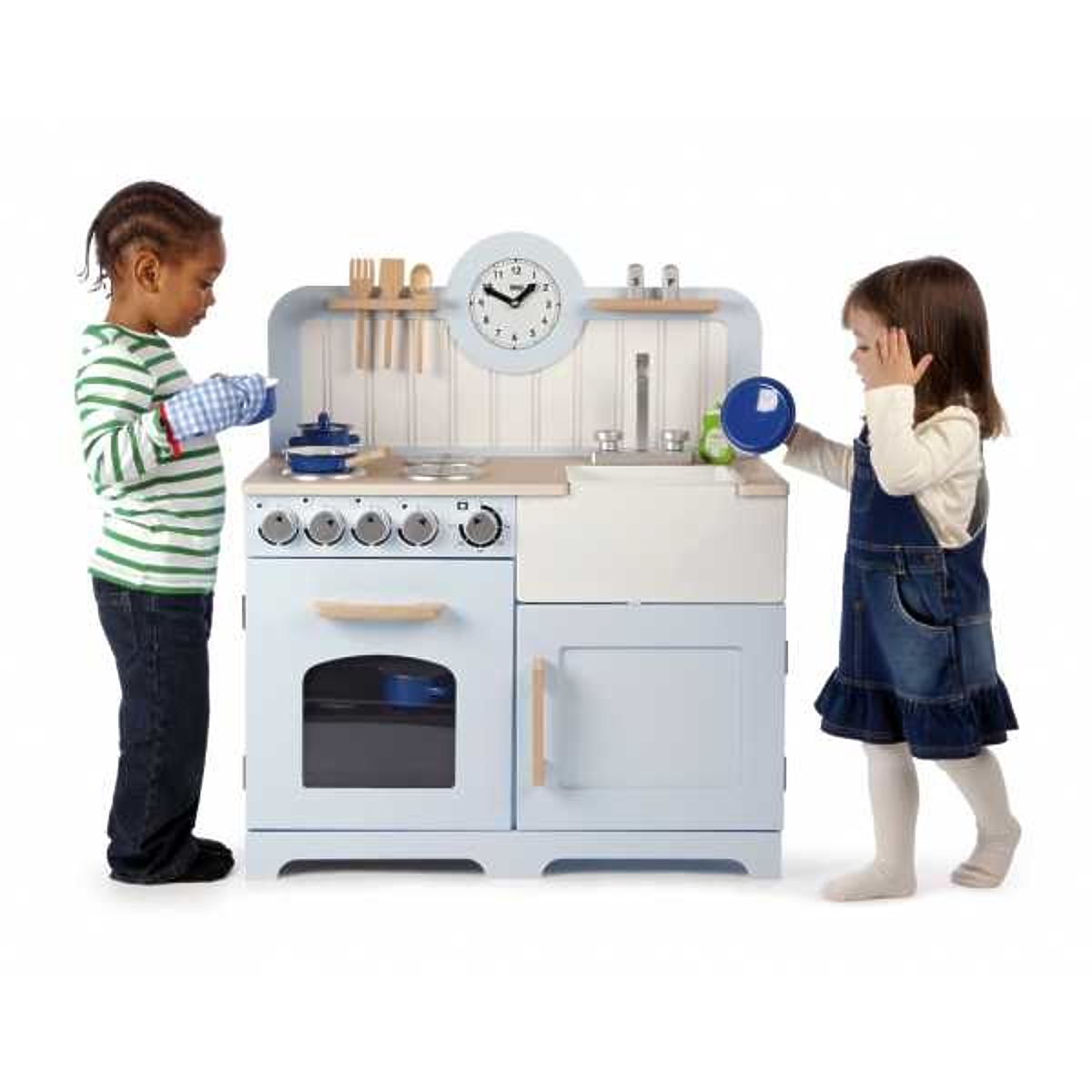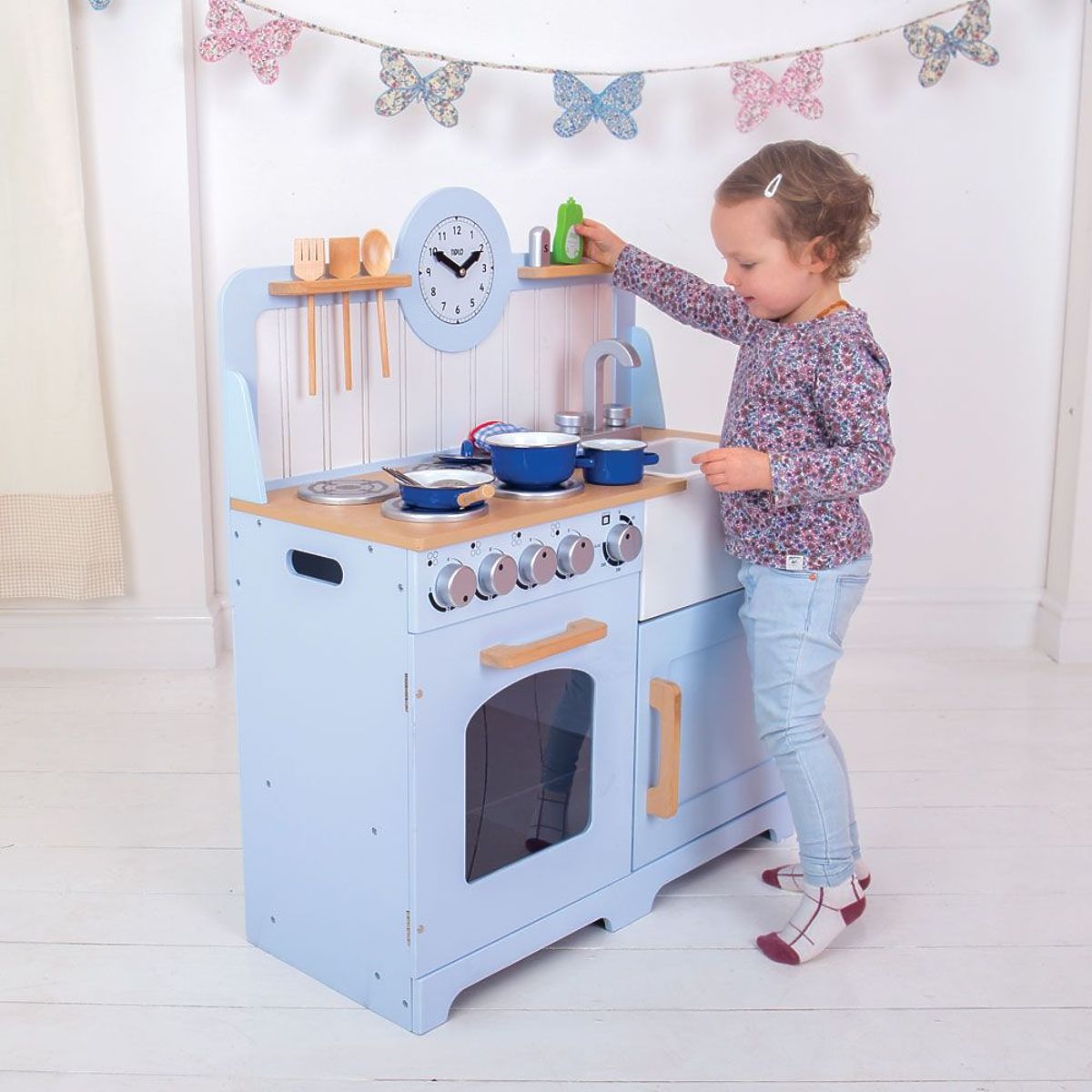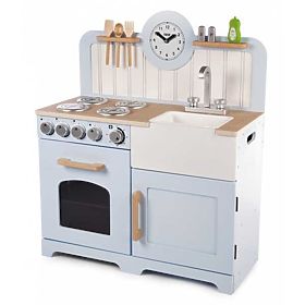 Tinerii bucătari în devenire se vor bucura de gătit și copt cu această bucătărie din lemn! Este echipată cu patru plite care sunt controlate de butoane rotative care emit un sunet de clic. Include, de asemenea, un cuptor cu raft și vizor, astfel încât tinerii bucătari să poată verifica mâncarea. În plus, are un dulap de depozitare, chiuvetă, ustensile care pot fi agățate (vezi imaginea), sare și piper și, în final, un ceas cu ace rotative. Bucătăria are un blat mai înalt, astfel încât să reziste mai mulți ani copiilor în creștere. Pe lateral are mânere pentru o prindere mai ușoară. O modalitate excelentă de a învăța copiii despre siguranța în bucătărie și alimentația sănătoasă. Susține jocul creativ și imaginar. Dezvoltă coordonarea mână-ochi și îndemânarea. Necesită asamblare după despachetare. Fabricat din materiale de calitate din surse responsabile. Conform standardului european de siguranță. Caracteristici principale: butoane rotative cu sunet, suprafață de lucru mai înaltă, transport mai ușor datorită mânerelor laterale, 3 piese de ustensile de bucătărie (solniță cu piper, bol de plastic în chiuvetă, agent de spălat vase), susține creativitatea și imaginația.