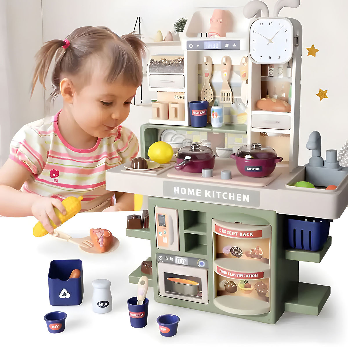 Fiecare copil adoră să observe, să imite și să ajute adulții în activitățile zilnice. Datorită bucătăriei, copilul dumneavoastră va avea ocazia să intre în rolul unui bucătar sau bucătăreasă și să pregătească mese delicioase pentru întreaga familie. Jucăria îi va învăța principiile gătitului, va dezvolta creativitatea și abilitățile manuale.