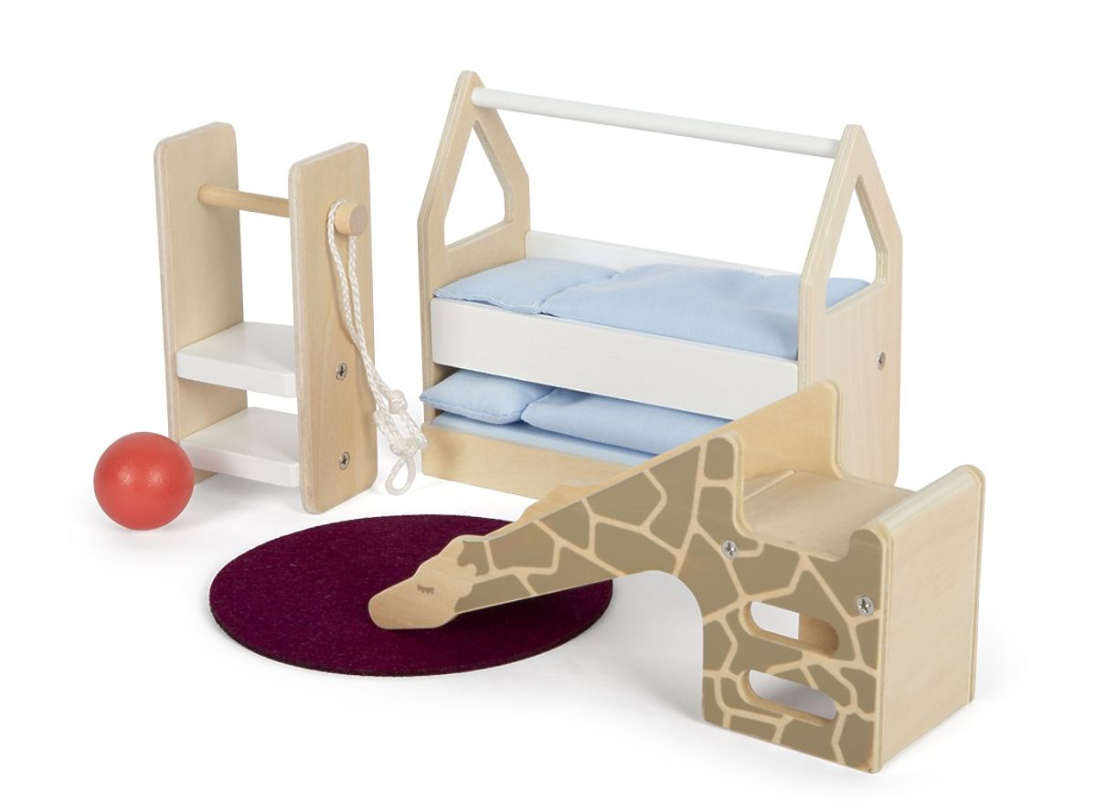 Ce cameră frumoasă! Cu siguranță va plăcea și copiilor dumneavoastră. Această cameră pentru copii nu este doar un accesoriu minunat pentru orice casă de păpuși, ci și motivează copiii să se joace creativ și să-și dezvolte imaginația. Este realizată astfel încât să semene cât mai mult cu mobilierul real. Include un pat în formă de căsuță cu un pat extensibil pentru oaspeți, lenjerie de pat, o poliță cu bară pentru agățat haine, o minge, o coardă de sărit și un covor mare de joacă. Și cel mai bun la final: toboganul Girafa, creat după modelul unui tobogan real pentru copii Girafa Wildlife (număr articol: 12424). Principalele caracteristici: mobilier modern și elegant pentru camera copiilor, tobogan Girafa creat după un tobogan real pentru copii, dezvoltă imaginația și motivează la joacă creativă.