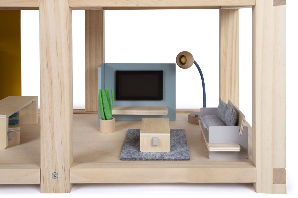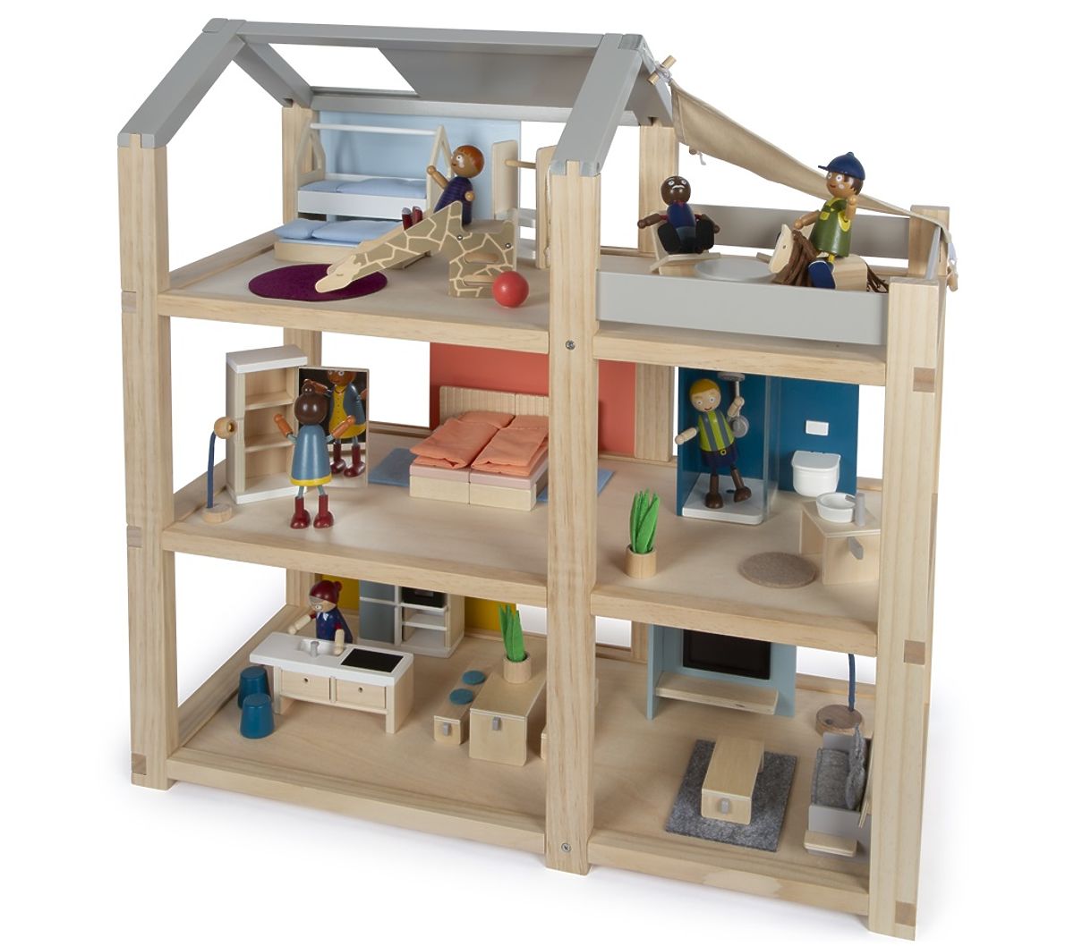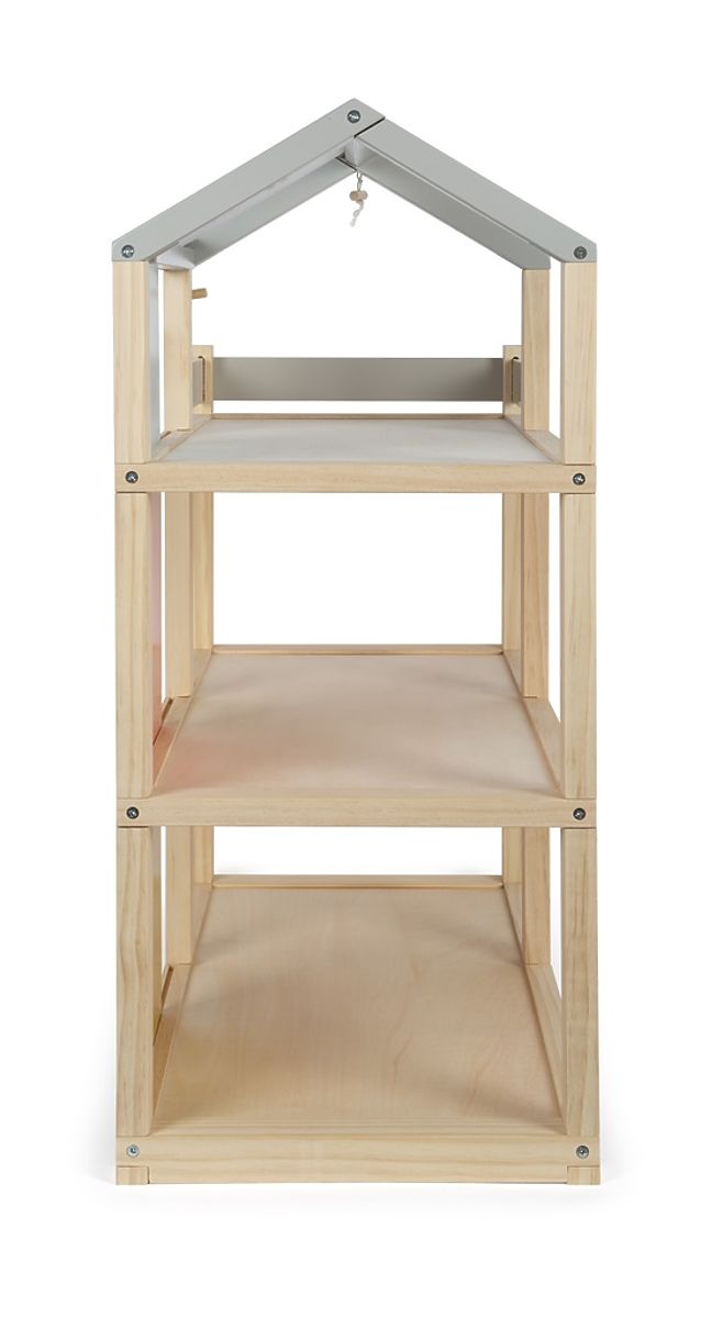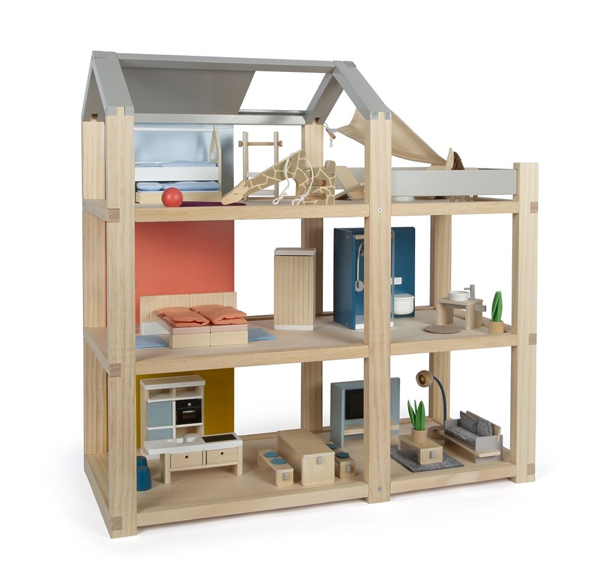 Această mare căsuță de lemn pentru păpuși în stil scandinav, cu trei etaje și o terasă spațioasă pe acoperiș, va deveni nu doar o jucărie distractivă și creativă, ci și un accesoriu de interior care va ieși în evidență în orice cameră. Căsuța are trei etaje. Este compusă dintr-un dormitor confortabil, o cameră pentru copii cu un tobogan cu girafă, o baie elegantă, o bucătărie modernă, o sală de mese fermecătoare, un living confortabil, o terasă spațioasă pe acoperiș și este complet mobilată cu mobilier detaliat pentru păpuși. Datorită pereților din spate glisanți, aspectul interiorului poate fi schimbat de fiecare dată. Pereții sunt utilizabili pe ambele părți, pe o parte având aspect de lemn natural, iar pe cealaltă parte sunt vopsiți în culori. Căsuța este imediat gata de joacă – nu este nevoie de niciun alt accesoriu. Principalele caracteristici: pentru păpuși de 12 cm, camere spațioase și o mare terasă pe acoperiș, complet echipată cu mobilier, peretele frontal deschis facilitează jocul, jucărie distractivă și creativă, accesoriu de interior elegant, stimulează creativitatea și îmbunătățește percepția spațială, sprijină dezvoltarea abilităților motorii, de vorbire și sociale.