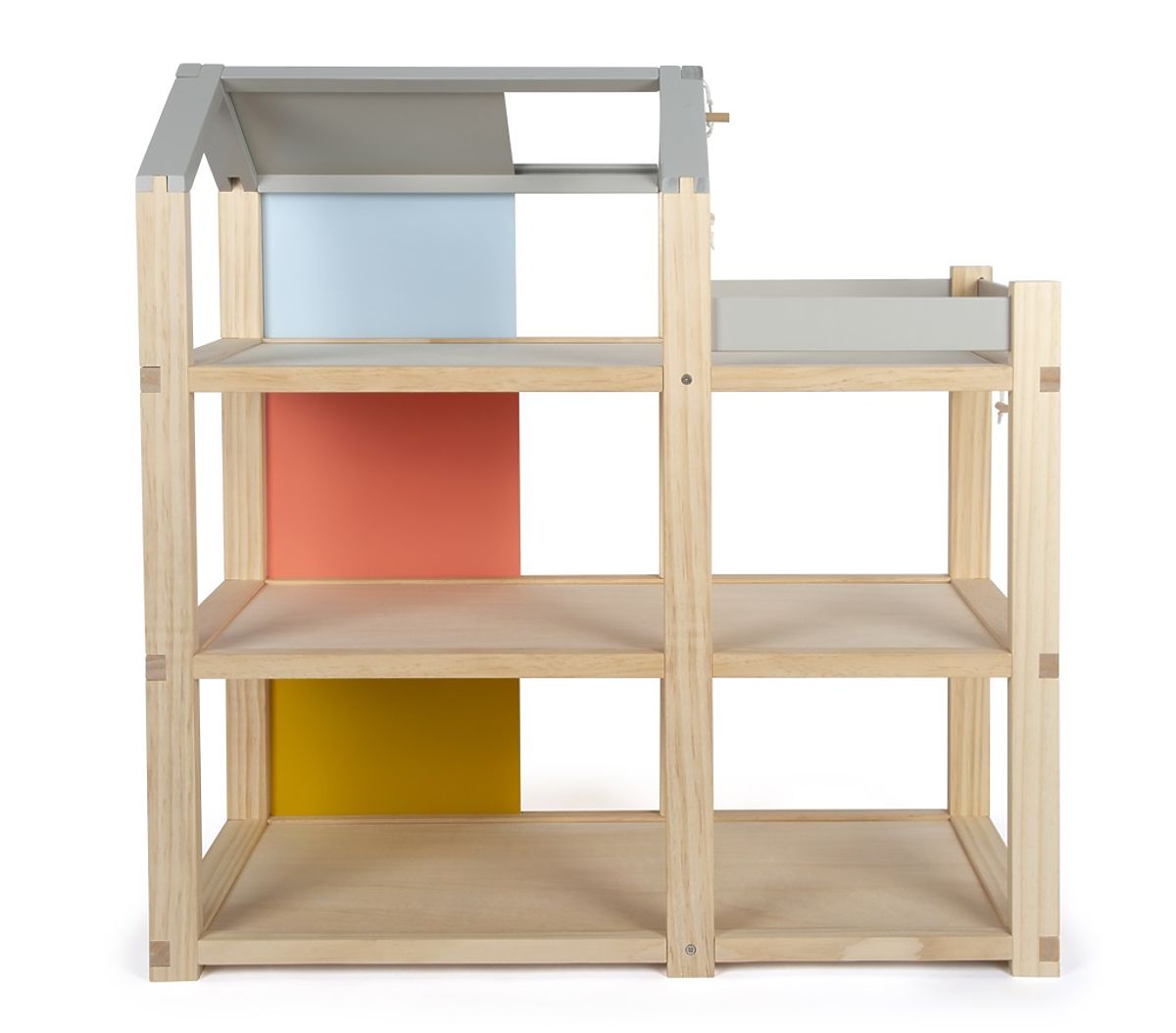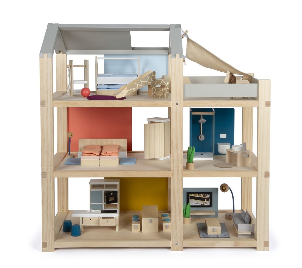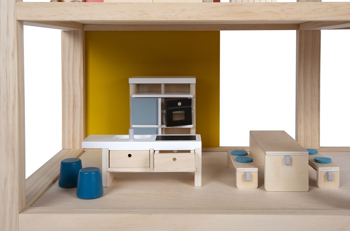 Această mare căsuță de lemn pentru păpuși în stil scandinav, cu trei etaje și o terasă spațioasă pe acoperiș, va deveni nu doar o jucărie distractivă și creativă, ci și un accesoriu de interior care va ieși în evidență în orice cameră. Căsuța are trei etaje. Este compusă dintr-un dormitor confortabil, o cameră pentru copii cu un tobogan cu girafă, o baie elegantă, o bucătărie modernă, o sală de mese fermecătoare, un living confortabil, o terasă spațioasă pe acoperiș și este complet mobilată cu mobilier detaliat pentru păpuși. Datorită pereților din spate glisanți, aspectul interiorului poate fi schimbat de fiecare dată. Pereții sunt utilizabili pe ambele părți, pe o parte având aspect de lemn natural, iar pe cealaltă parte sunt vopsiți în culori. Căsuța este imediat gata de joacă – nu este nevoie de niciun alt accesoriu. Principalele caracteristici: pentru păpuși de 12 cm, camere spațioase și o mare terasă pe acoperiș, complet echipată cu mobilier, peretele frontal deschis facilitează jocul, jucărie distractivă și creativă, accesoriu de interior elegant, stimulează creativitatea și îmbunătățește percepția spațială, sprijină dezvoltarea abilităților motorii, de vorbire și sociale.