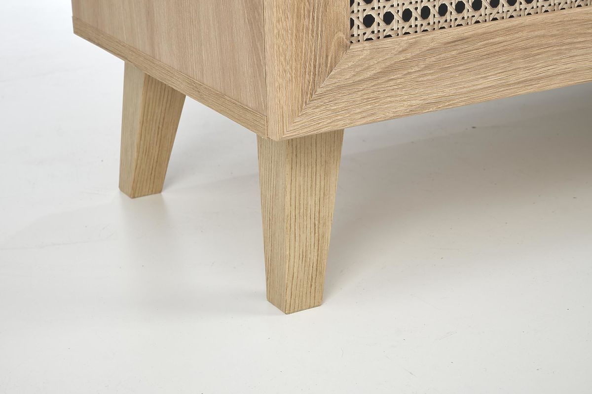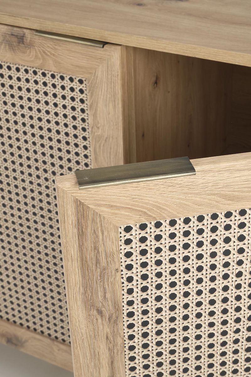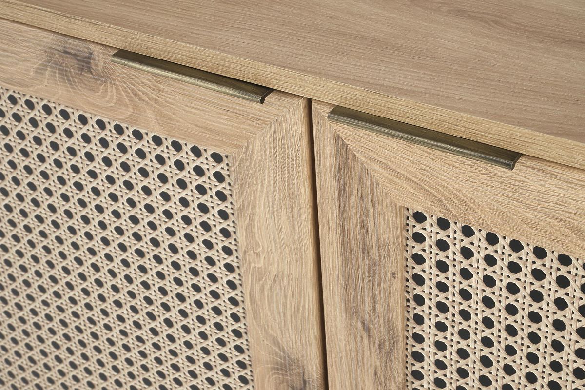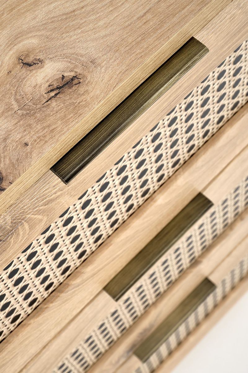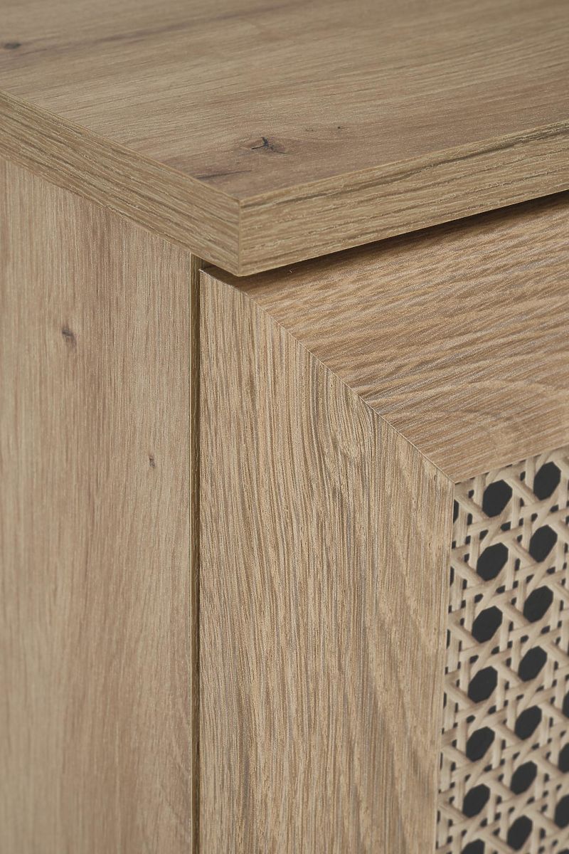 Decorul stejar artisan împreună cu inserțiile la modă în modelul împletiturii vieneze conferă comodei un aspect boho unic care atrage imediat atenția.