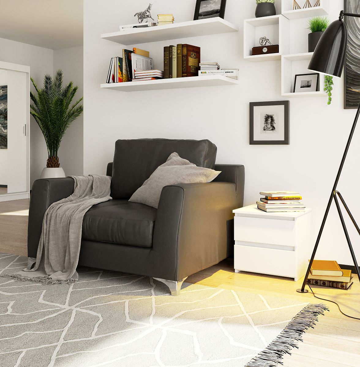 Noptiera este una dintre piesele de bază de mobilier din dormitor. Noptiera este de culoare albă, fabricată din placă laminată cu grosimea de 16 mm, care este, de asemenea, rezistentă la abraziune. Fețele și lateralele noptierei sunt acoperite cu margine ABS, care oferă o rezistență mai mare la mici deteriorări mecanice, cum ar fi zgârieturile. Are două sertare spațioase fără mânere, în care pot fi depozitate toate obiectele necesare care trebuie să fie la îndemână. Noptiera are dimensiuni de 40 cm în lungime, 40 cm în înălțime și 35 cm în adâncime. Sertarele sunt echipate cu șine metalice cu role, care pot fi ușor scoase și curățate dacă este necesar. Datorită modelului și culorii universale, se potrivește în orice dormitor și poate fi combinată cu succes cu alte piese de mobilier din sistemul CLP. Aspectul modern și în același timp minimalist permite o integrare ușoară în multe stiluri de interior. Placa este suficient de mare pentru a găzdui atât o lampă de noapte, cât și mici decorațiuni sau o carte.