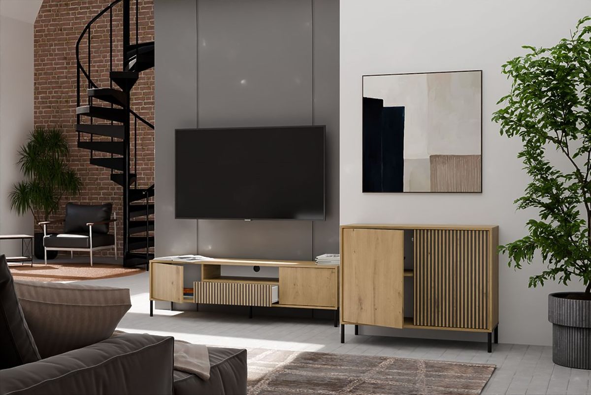 Comoda KAMARO 2D SLIM/NETED DUB ARTISAN este o combinație de estetică și funcționalitate, perfectă pentru sufragerie, cameră de oaspeți, dormitor sau birou. Datorită fațadei canelate a uneia dintre uși (asemănătoare cu lamelele), mobilierul capătă un aspect modern și original, care se potrivește perfect în interioarele moderne.