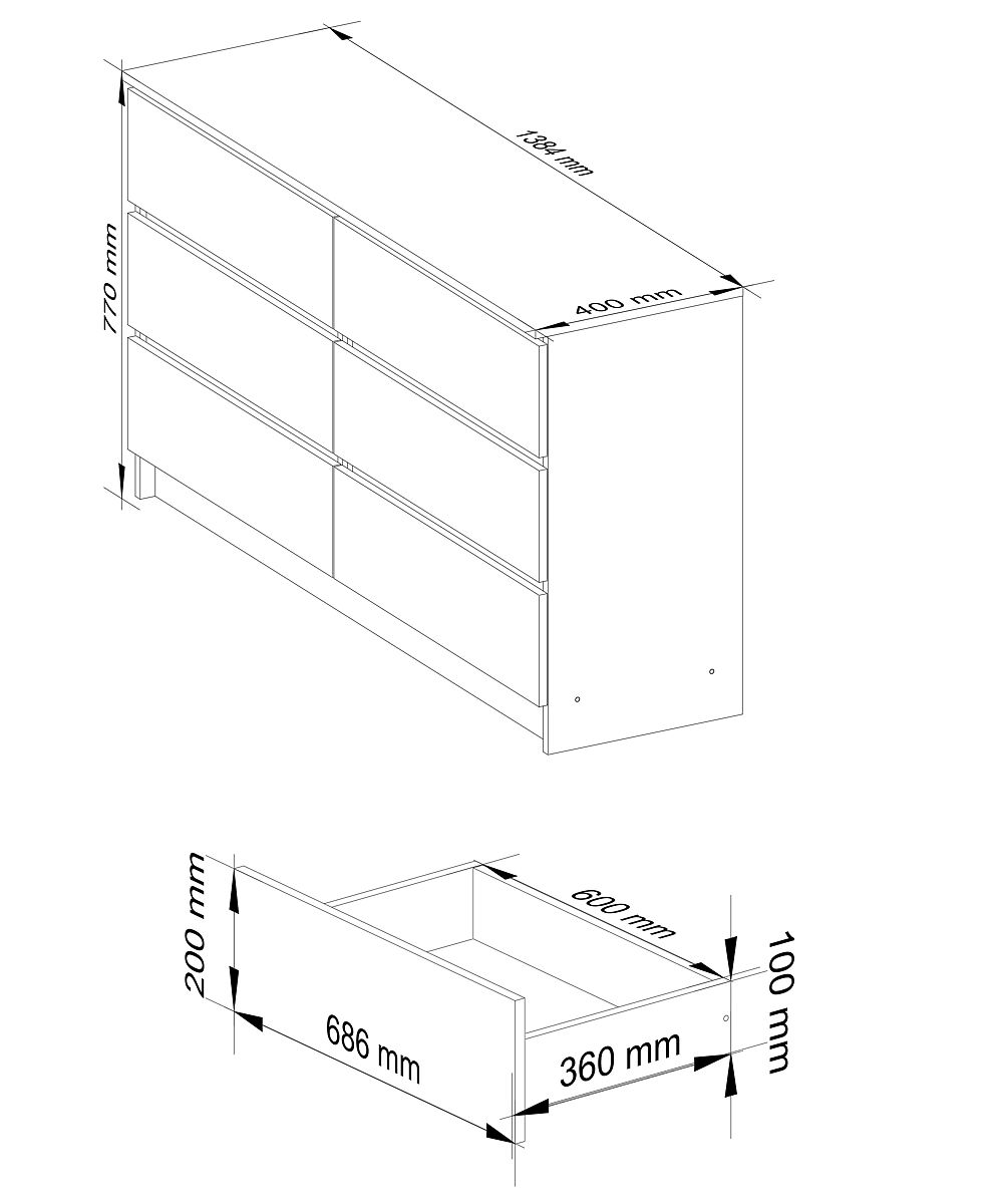 Materialul din care este fabricată comoda este o placă laminată rezistentă la abraziune cu grosimea de 16 mm. Marginile sale sunt acoperite cu bandă ABS, ceea ce le face rezistente la deteriorare. Este echipată cu șase sertare. Fiecare dintre ele se mișcă pe glisiere metalice cu bile - acest mecanism funcționează lin și fără probleme.