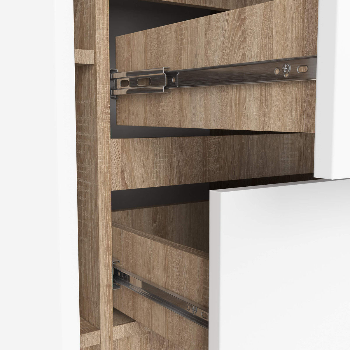 - Sertarele se mișcă pe ghidaje metalice cu bile