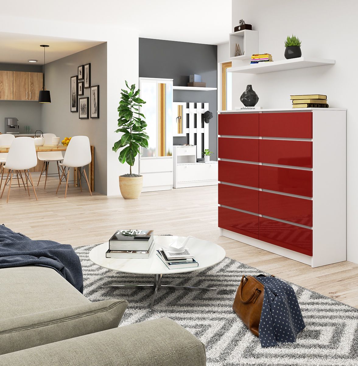 Comoda albă / roșu lucios este un mobilier care arată bine pe fundal alb, albastru marin, gri și cappuccino, dar cei mai îndrăzneți o pot combina cu portocaliu energic, verde sticlă sau violet profund. Mobilierul se potrivește excelent în living, ateliere de croitorie și artizanat, în birouri moderne amenajate într-un stil îndrăzneț cu farmec. De asemenea, poate fi integrat cu succes în aranjamente clasice.