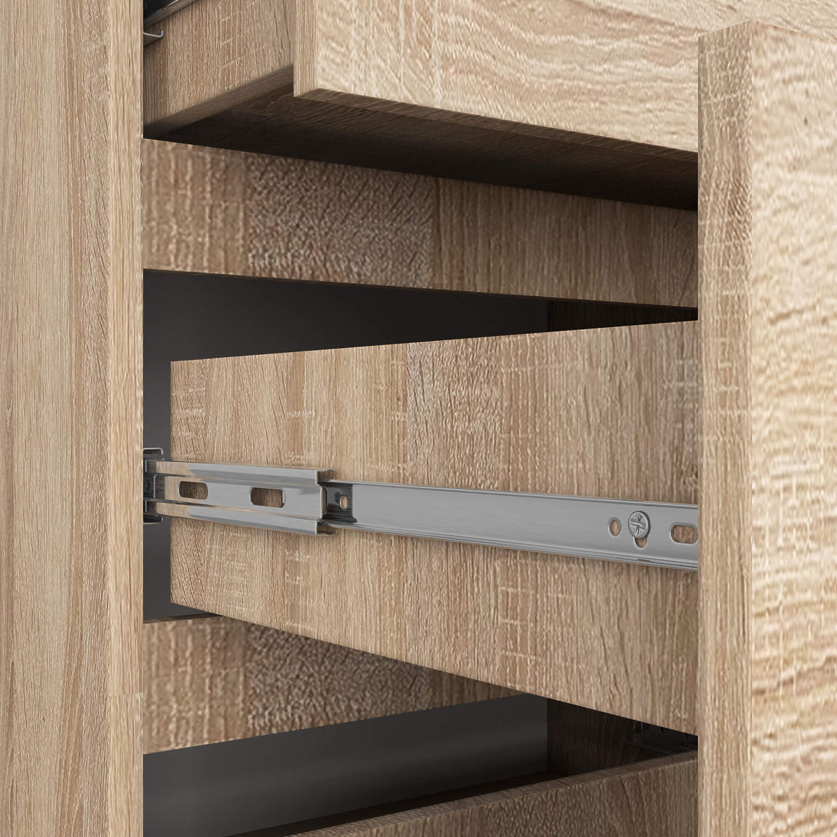 Cele zece sertare spațioase sunt locul ideal pentru a depozita documente, cutii cu mărunțișuri sau haine. Acest lucru facilitează menținerea ordinii în apartament mai mult ca niciodată! Glisarea lină a sertarelor este asigurată de ghidajele metalice cu bile, astfel încât nimic nu se blochează, iar mișcarea sertarului este netedă și silențioasă.