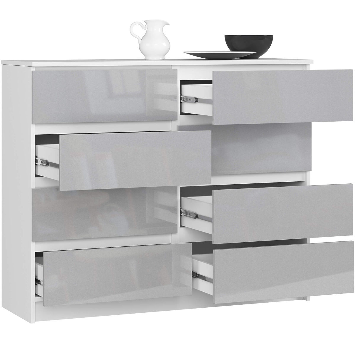 Oferim o comodă mare cu 8 sertare. Comoda are un corp alb semi-mat realizat din placă laminată cu grosimea de 16 mm, foarte rezistentă la uzură. Fronturile sunt realizate din placă MDF cu strat acrilic de 19 mm, care se caracterizează prin durabilitate ridicată și rezistență la decolorare cauzată de lumina intensă a soarelui. Marginile sunt prevăzute cu o margine ABS, care asigură o protecție ridicată împotriva deteriorării mecanice și uzurii. Sertarele fără mânere au o culoare modernă metalică cu luciu înalt. Sertarele sunt ghidate pe șine metalice cu bile. Comoda are un aspect simplu și totodată foarte versatil. Se potrivește perfect în orice interior, arătând la fel de bine în sufragerie, dormitor sau chiar în birou. Datorită sertarelor foarte spațioase și voluminoase, va fi ordine în fiecare cameră. La acest model de comodă se poate asorta cu succes și alt mobilier din seria CLP.