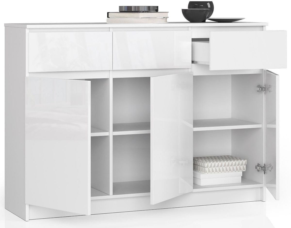 Comodă albă lucioasă cu 3 sertare și 3 uși. .. mai mult