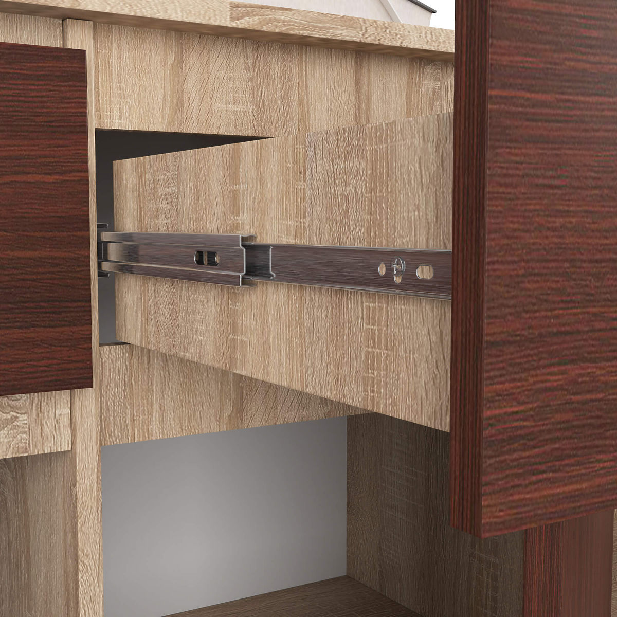 Comodă mare, foarte spațioasă și funcțională, realizată din placă laminată de calitate, rezistentă la abraziune, se va prezenta frumos în orice cameră de zi, dar și în alte spații rezidențiale sau de birou. Mobilierul folosește o placă durabilă marca Kronospan cu o grosime de 16 milimetri. Sertarele se deplasează pe șine metalice, astfel încât mobilierul este ușor de utilizat în viața de zi cu zi. Marginile mobilierului sunt acoperite cu bandă ABS, care oferă protecție împotriva deteriorării. Produsul este destinat montării individuale. Culorile universale wenge și sonoma se combină excelent și formează un ansamblu atemporal. Dacă așteptați de la o comodă ideală calitate înaltă, design atractiv și un preț accesibil, această ofertă este pentru dumneavoastră.