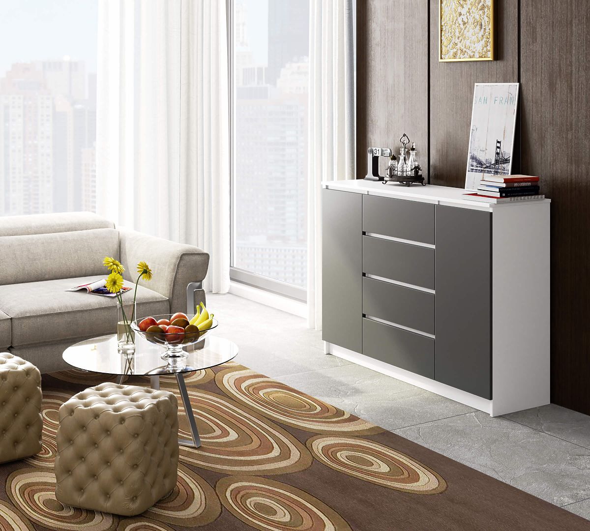 Comodă cu 2 uși și 4 sertare, albă și gri grafit. .. mai mult