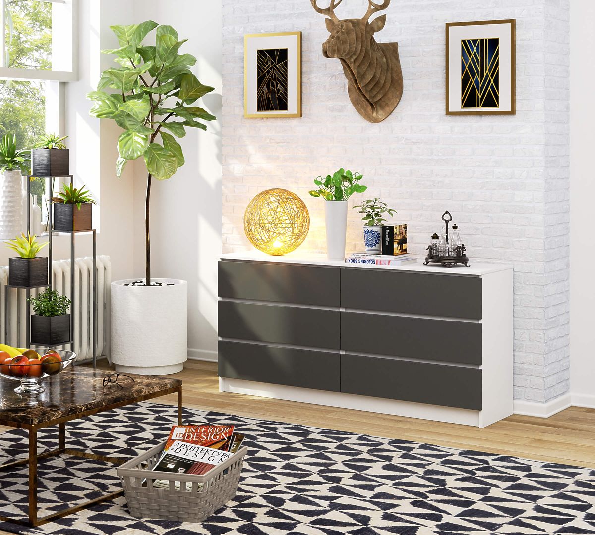 Comoda este un mobilier atât de versatil încât poate fi utilizat în orice încăpere. Cel mai frecvent apare în camerele de zi, camerele copiilor, dormitoare, săli de mese sau birouri. Comoda ar trebui să se potrivească cu celelalte piese de mobilier din aranjament și, în același timp, să se distingă printr-o execuție solidă și atentă și funcționalitate. Produsul prezentat de 160 cm este un model modern păstrat într-o nuanță atemporală. Combinația de alb și gri grafit va atrage fără îndoială persoanele care preferă stilul minimalist și interioarele amenajate în stil scandinav. Comoda este echipată cu șase sertare spațioase. Se deschide și se închide ușor. Își găsește utilitatea atât în spațiile de locuit, cât și în cele de birou.