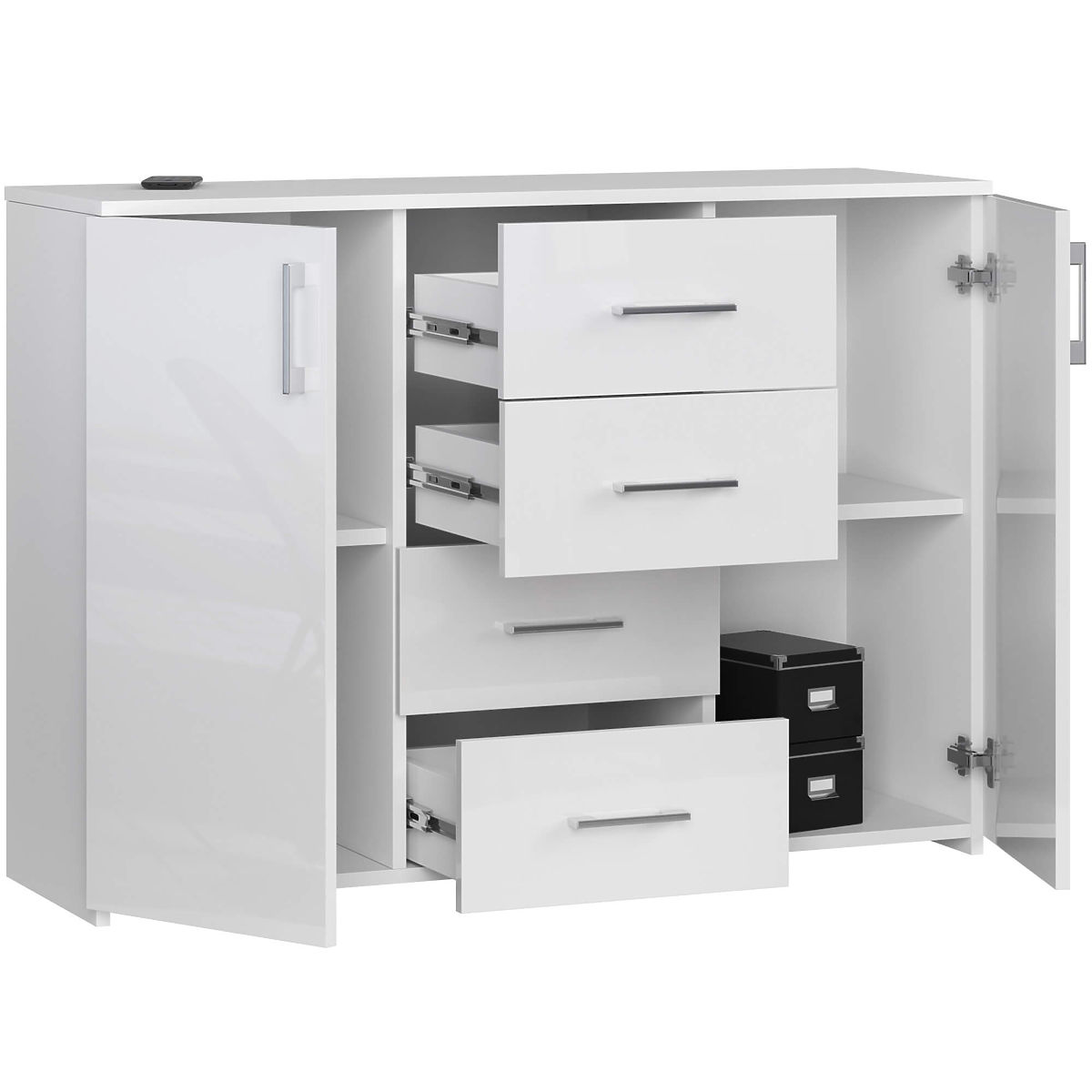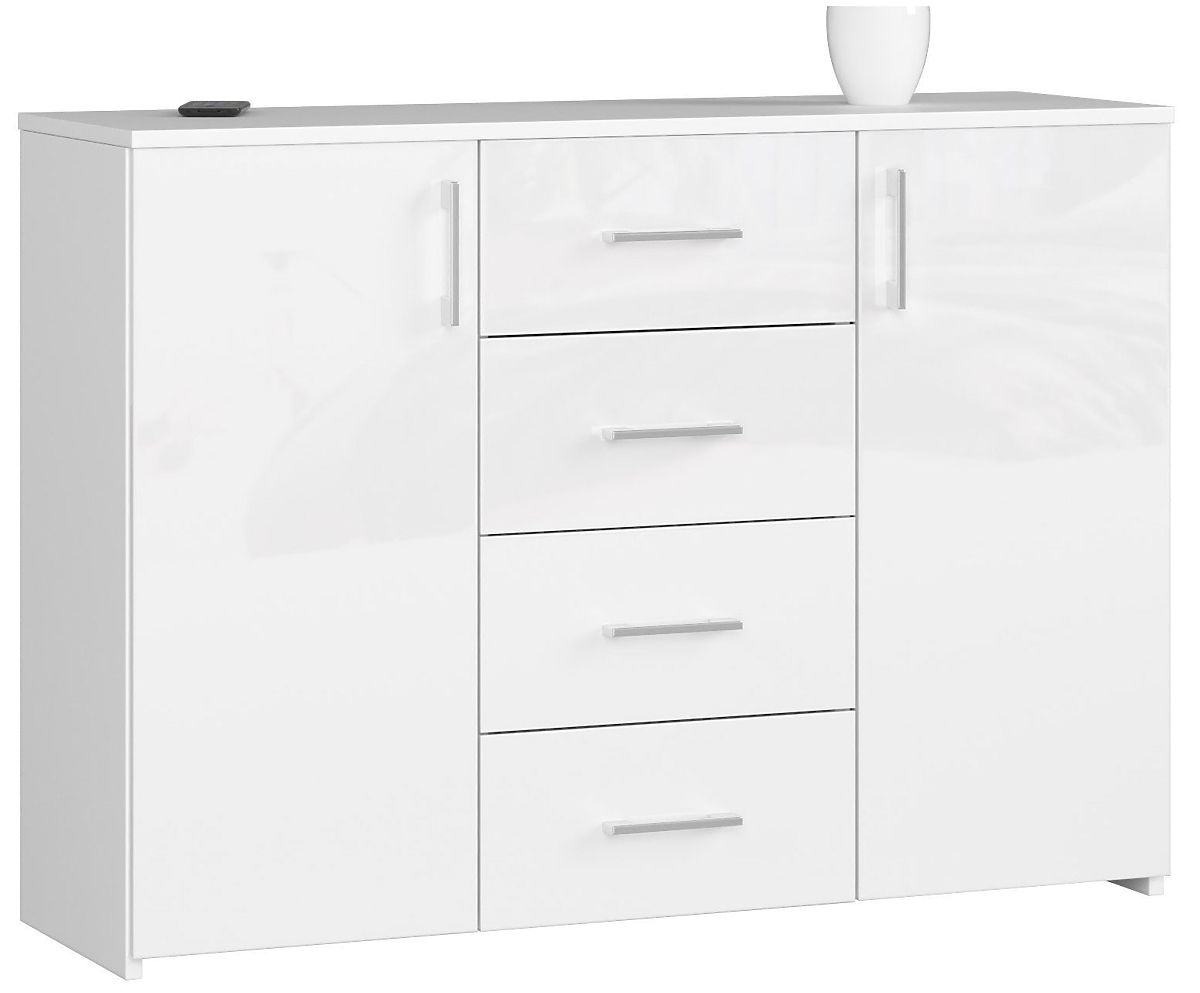 Comodă albă lucioasă cu 4 sertare și 2 uși. .. mai mult