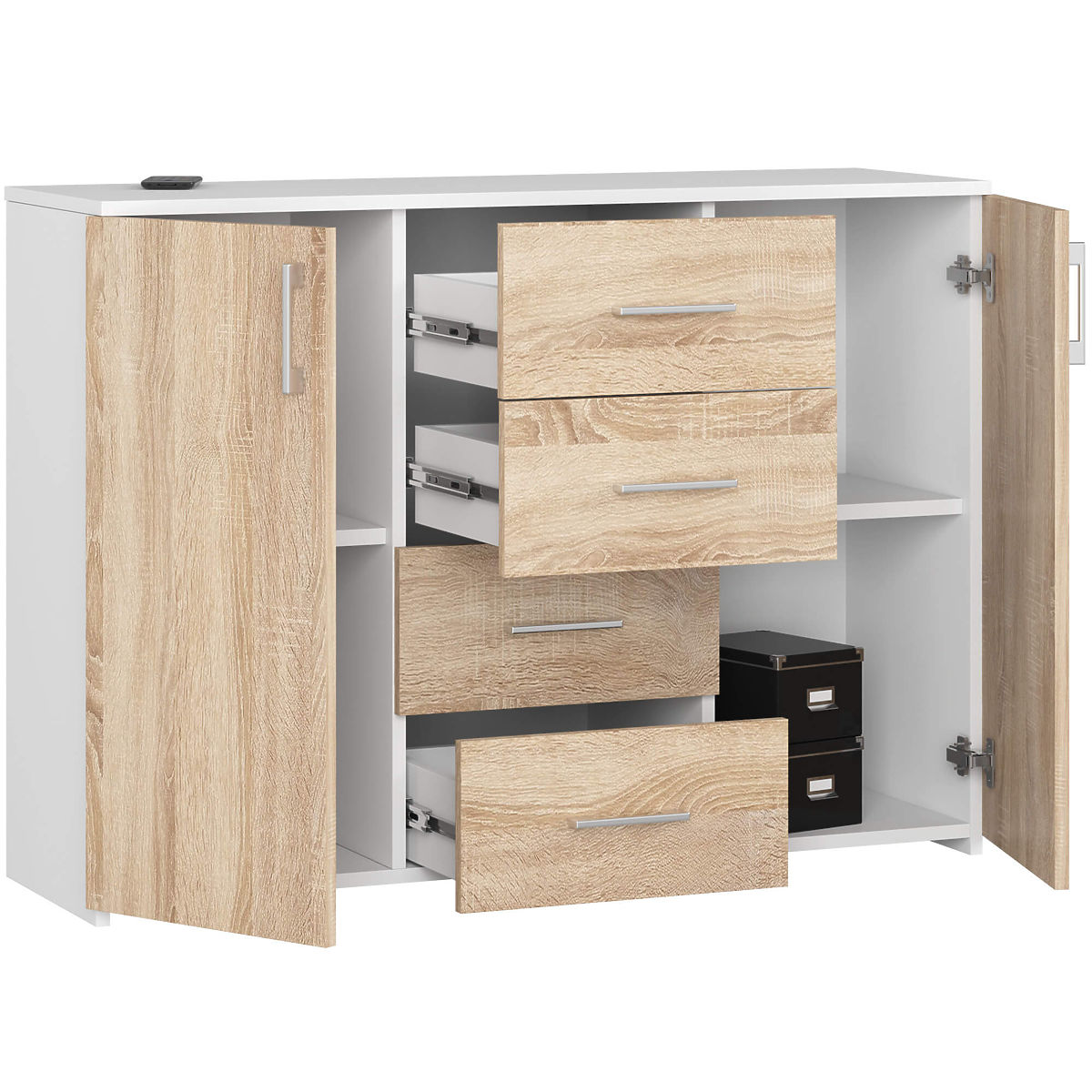 Comodă albă cu fațade Stejar Sonoma și sertare spațioase. .. mai mult