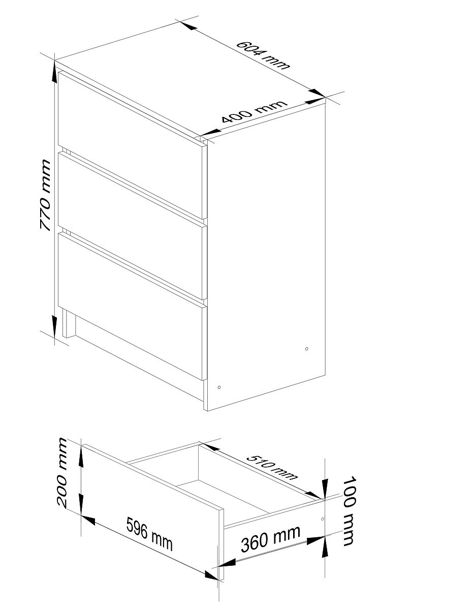 Comodă cu 3 sertare din placă laminată rezistentă la abraziune. .. mai mult