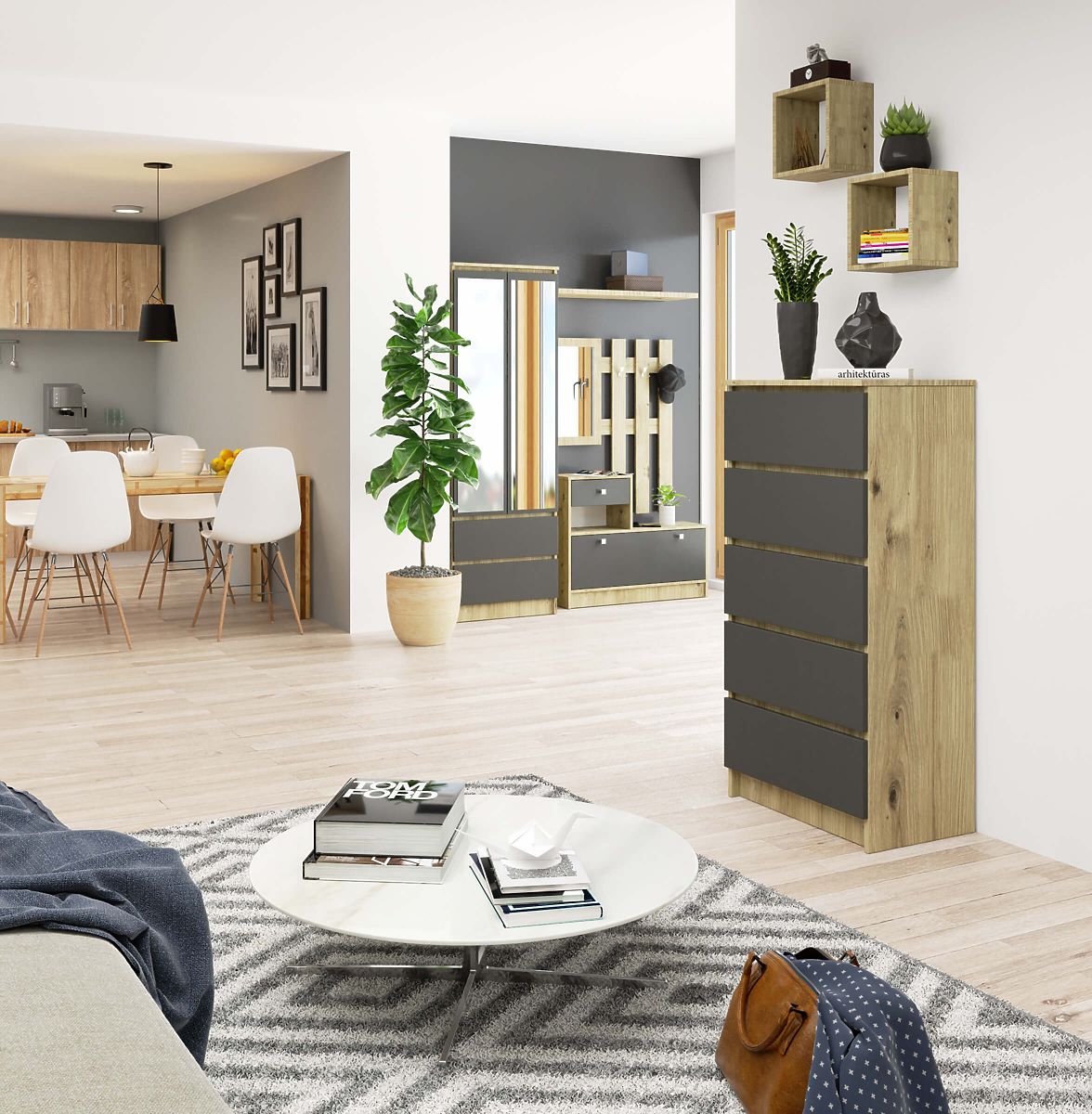 Comodă cu 5 sertare, din placă laminată, Stejar Artisan și Gri Grafit. .. mai mult
