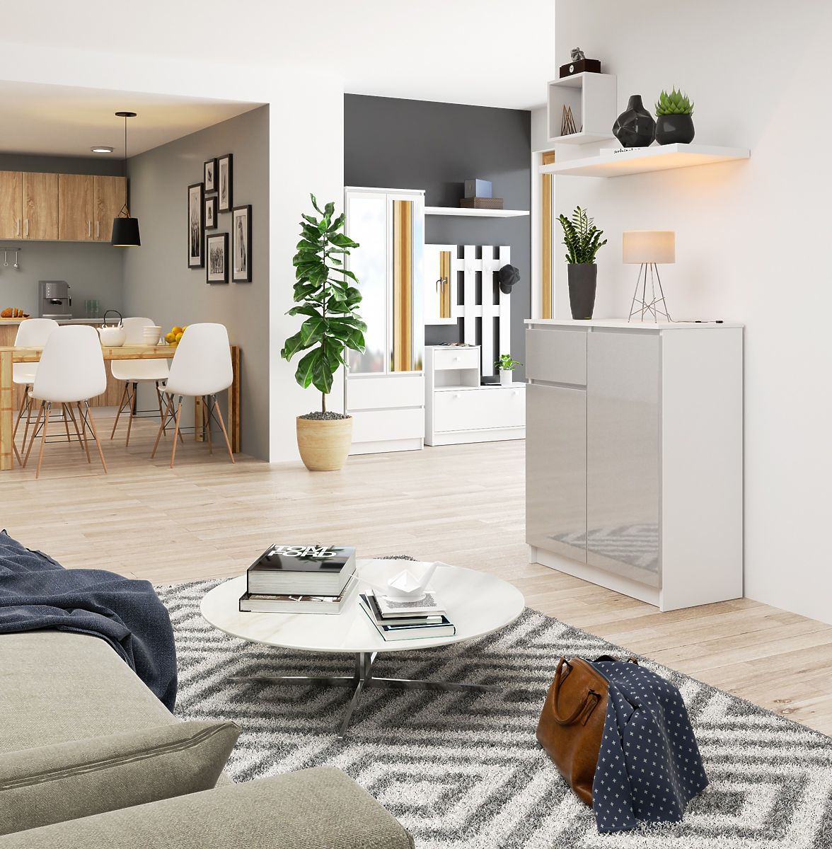 Comoda K 80 alb-metalică este un mobilier modern, chiar minimalist, dar în același timp universal din punct de vedere al funcționalității. Oferă multe opțiuni de utilizare – se potrivește atât ca dulap de haine în camera copilului, cât și ca mobilier de depozitare pentru obiecte mici în sufragerie sau dormitor, și chiar ca dulap practic pentru chei, căciuli sau genți în hol. Se poate potrivi perfect și într-o sufragerie minimalistă.