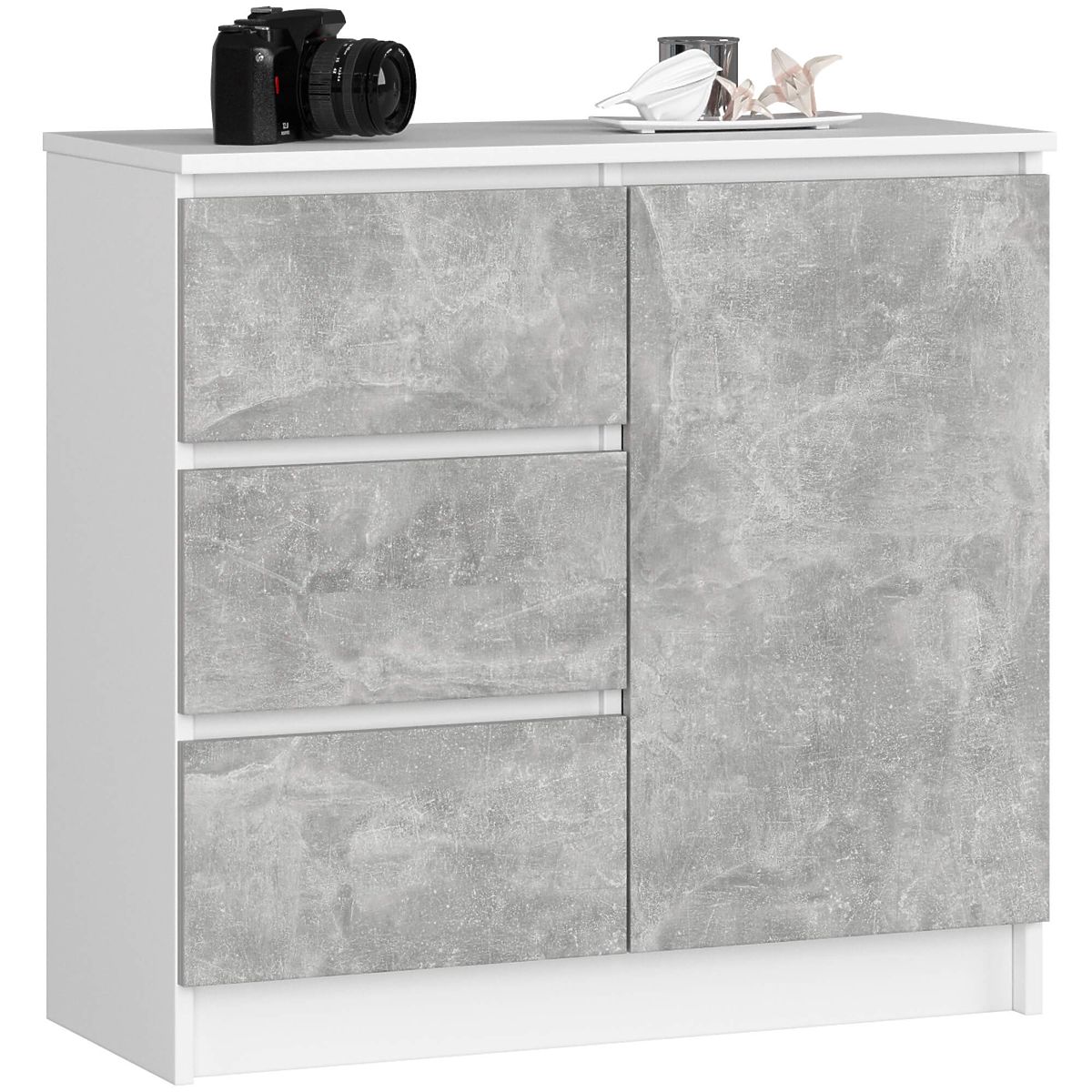 Comoda mică este un element de mobilier care își găsește utilitatea în orice încăpere. Culorile moderne, construcția solidă și prelucrarea atentă au dus la crearea unui dulap care se va dovedi util, de exemplu, în hol, living sau camera tineretului, precum și în dormitor. Poate fi folosită și în spațiul de birou, unde va permite stocarea multor documente și altor necesități de birou. Comoda este compusă dintr-o ușă (în interior sunt două rafturi) și 3 sertare. Mobilierul combină culorile alb și beton.