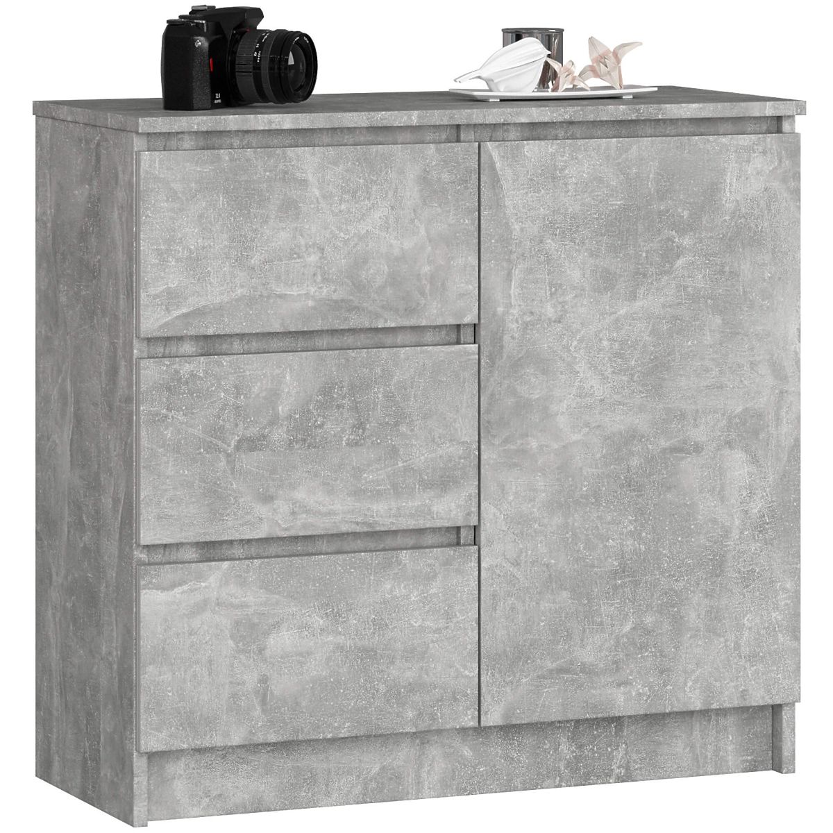 Comoda mică este un element de mobilier care își găsește utilitatea în orice cameră. Culorile moderne, construcția solidă și finisajul atent au dus la crearea unui dulap care se va dovedi util, de exemplu, în hol, living sau camera de studiu, dar și în dormitor. Poate fi utilizată și în spațiile de birou, unde va permite depozitarea multor documente și alte articole de birou. Comoda este compusă dintr-o ușă (în interior sunt două rafturi) și 3 sertare. Mobilierul combină culoarea betonului.