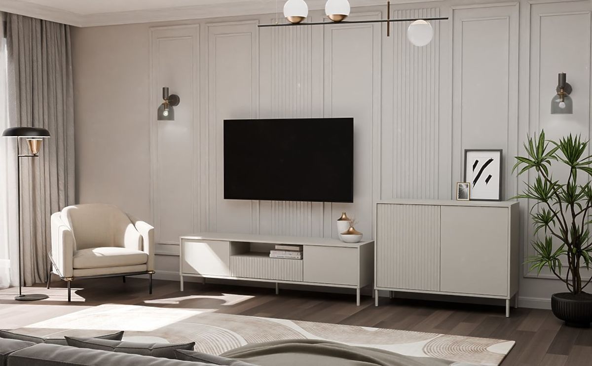 CULOARE:Comoda KAMARO 2D SLIM/HLADKÝ KAȘMIR este o combinație de estetică și funcționalitate, care se potrivește perfect în camera de zi, camera de oaspeți, dormitor sau birou. Datorită combinației panoului frontal neted cu cel lamelar (care amintește de lamele), mobilierul capătă un aspect modern și original, care se potrivește perfect în interioarele contemporane.