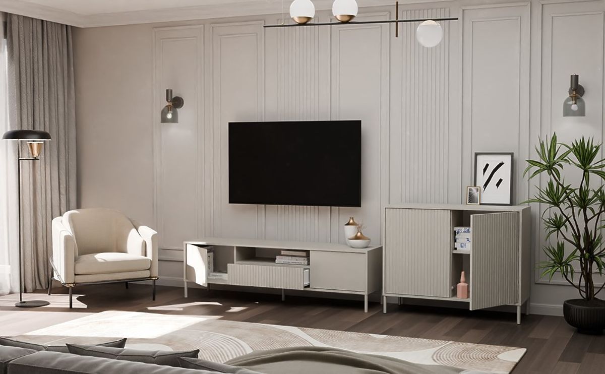 CULOARE: KAȘMIRELEGANȚĂ ȘI PRACTICITATE ÎNTR-UNULComoda KAMARO 2D SLIM KAȘMIR este o combinație de estetică și funcționalitate, potrivită perfect pentru living, cameră de oaspeți, dormitor sau birou. Datorită panoului frontal cu caneluri (asemănător cu lamele), mobilierul capătă un aspect modern și original, care se integrează perfect în interioarele contemporane.