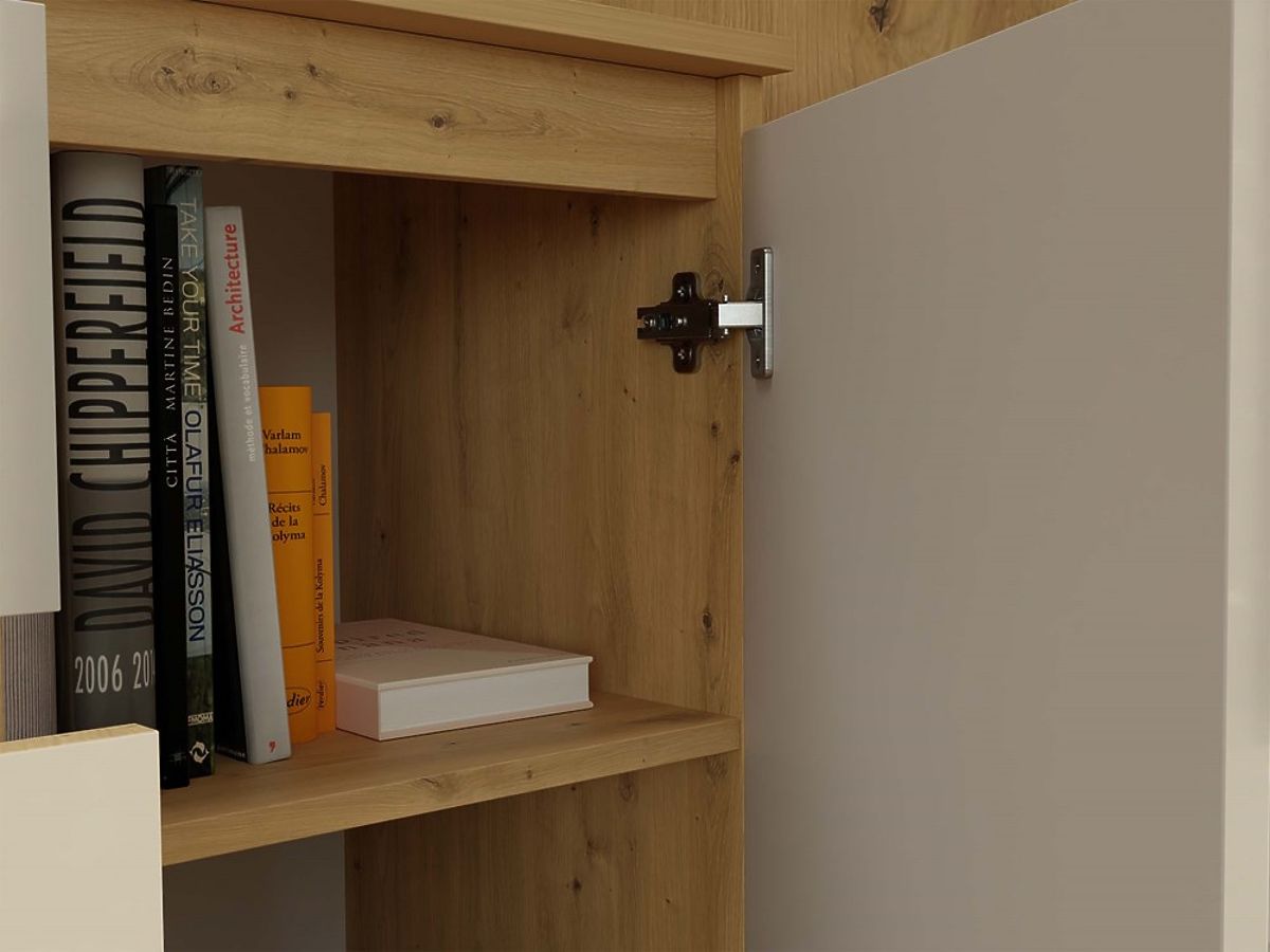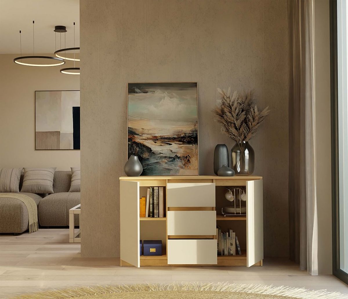 Comodă modernă cu 2 uși și 3 sertare, în nuanțe de Kashmir și Stejar Artisan. .. mai mult