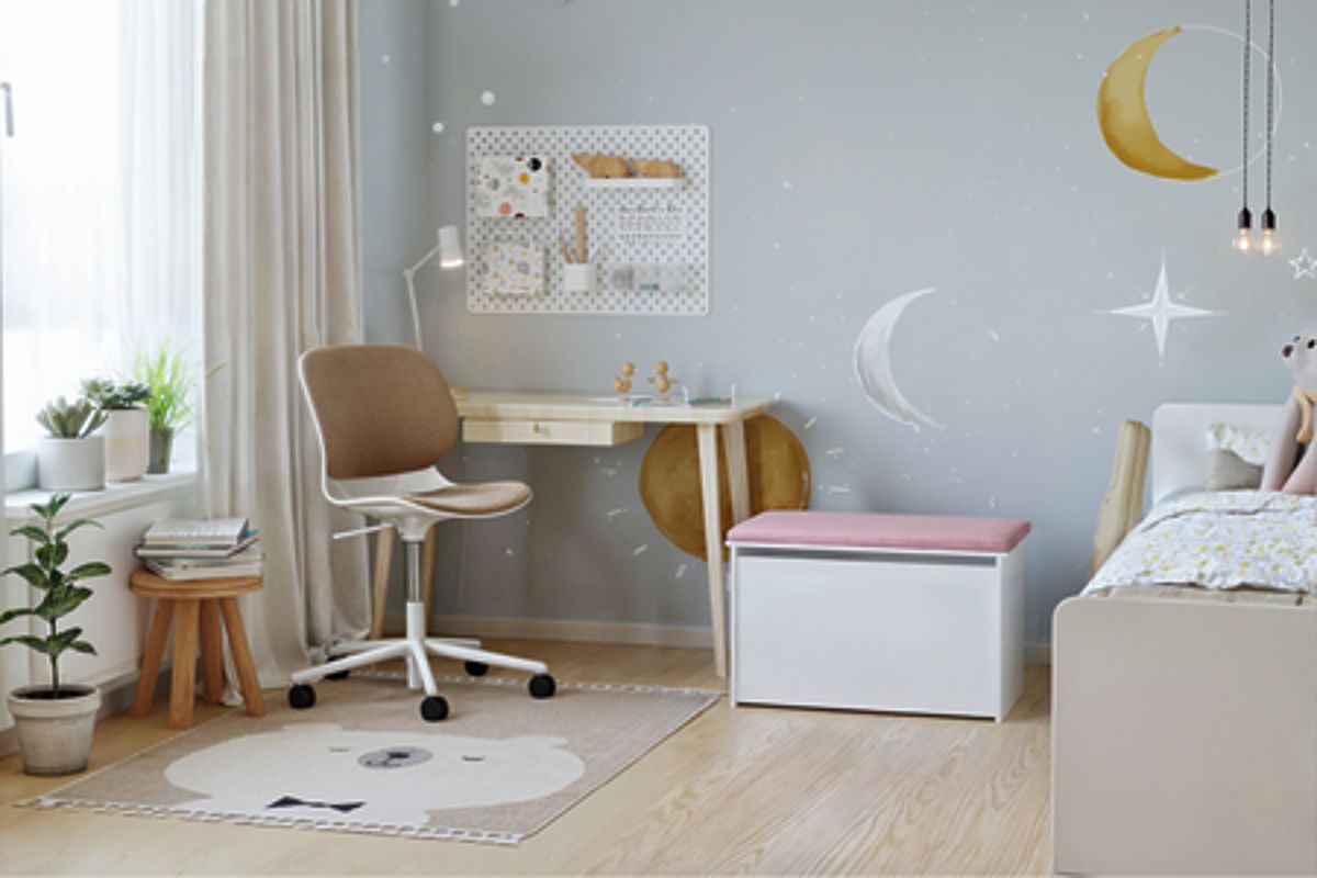Cufărul DARIA combină spațiozitatea cu un aspect estetic, ceea ce îl face soluția ideală pentru orice cameră de copil, dar se potrivește la fel de bine și în alte părți ale casei, cum ar fi holul sau dormitorul. Șezutul tapițat, acoperit cu un material moale, asigură confortul, permițând copilului să stea pe el în timpul jocului sau îmbrăcării. Datorită pistonului cu gaz solid, capacul cufărului se deschide lin și fără efort, permițând copilului să folosească conținutul său ușor și în siguranță. Interiorul spațios permite depozitarea jucăriilor, cărților și altor mărunțișuri, menținând astfel camera mereu ordonată. Datorită designului și funcționalității sale, cufărul DARIA devine nu doar un element practic, ci și un accent estetic în camera copilului.