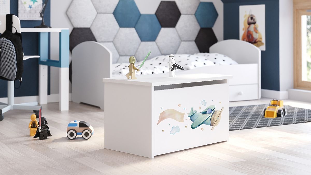 Banaby.ro » Mobilier pentru copii / Comode și dulapuri pentru copii / Cutii pentru jucării / Ladă de jucării Daria albă cu imprimeu Avion