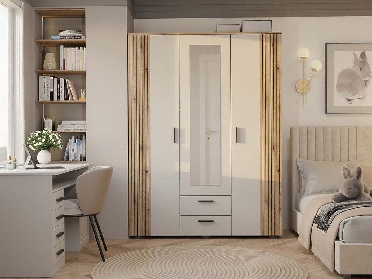 DULAP AVA 150 CM OGLINDĂ 2 SERTARE FAȚADĂ CANELATĂ STEJAR EVOKE BEJ CAȘMIR