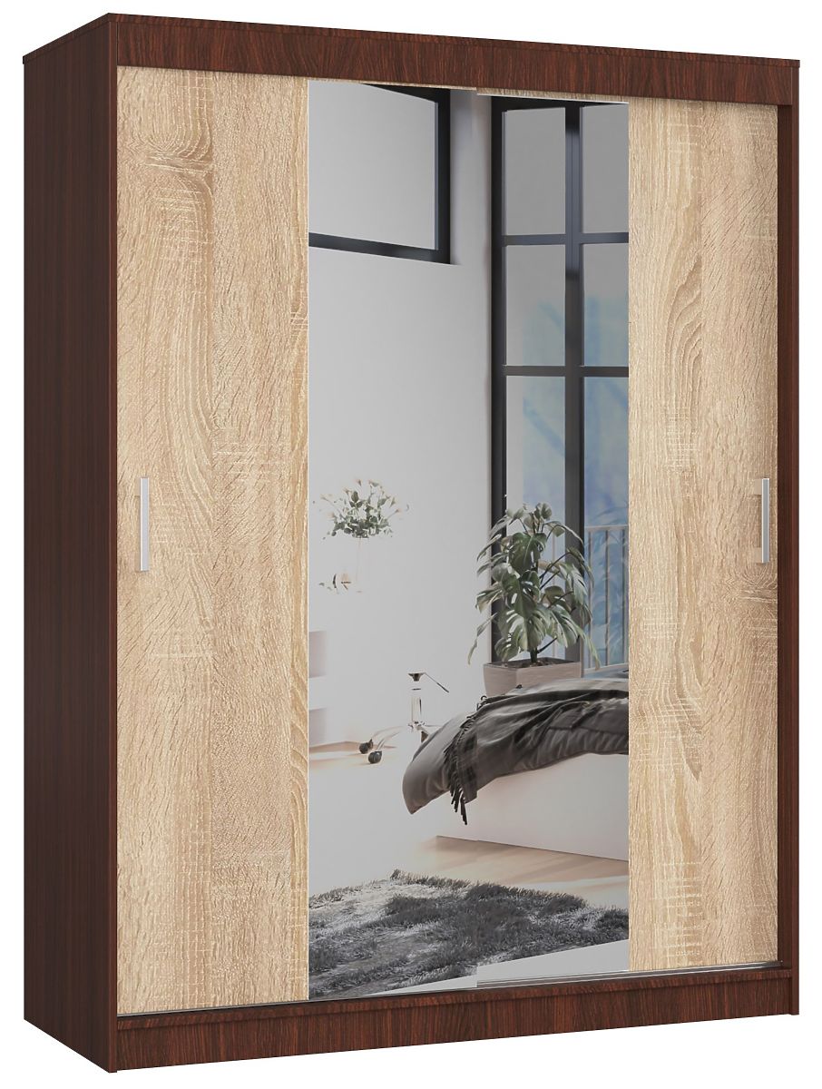 Dulap cu uși glisante în culoarea wenge / sonoma, având o lungime de 150 cm, cu rafturi și bară pentru haine. Suprafață mare de utilizare.