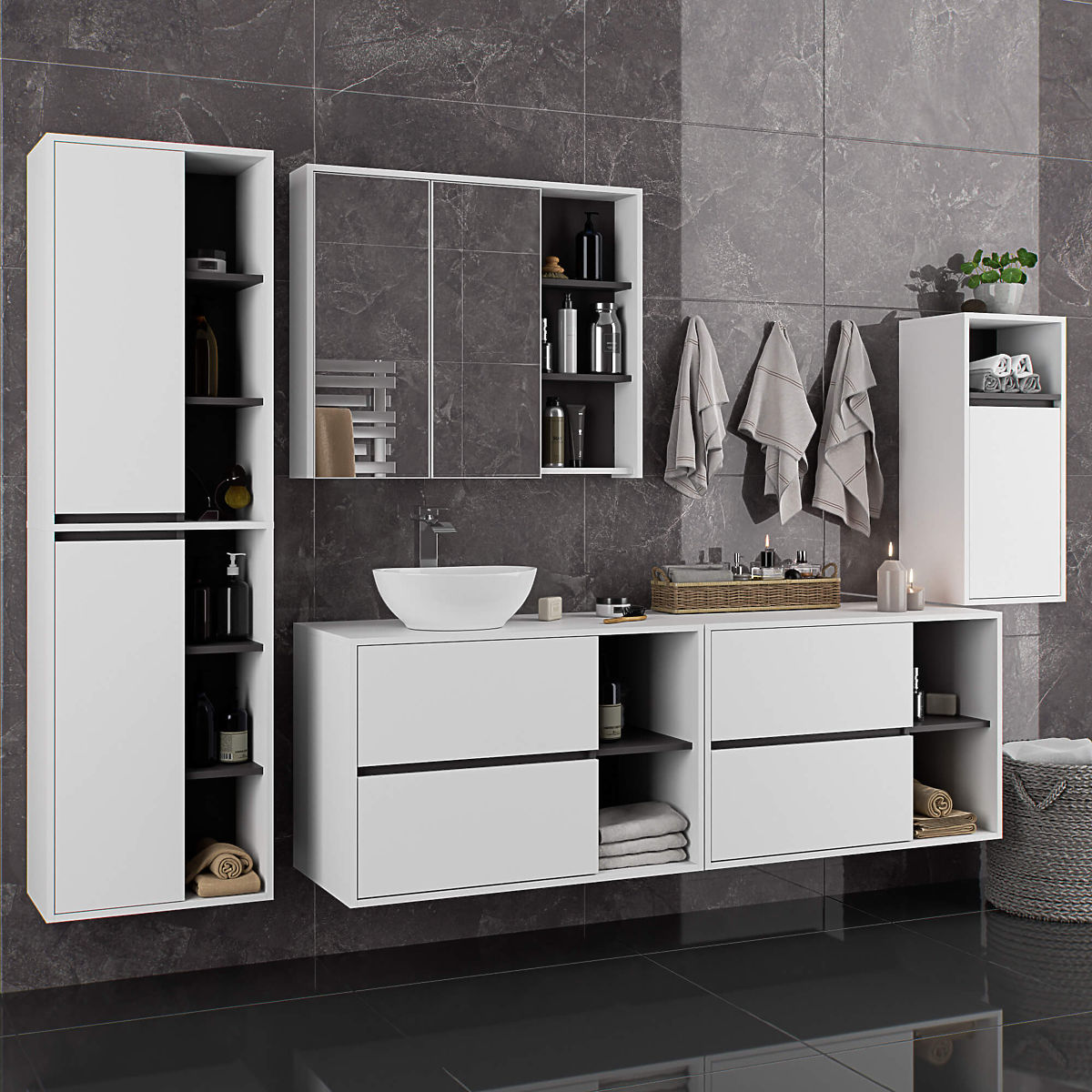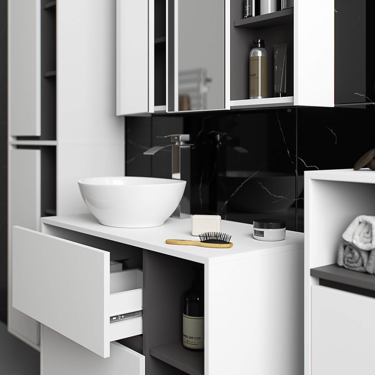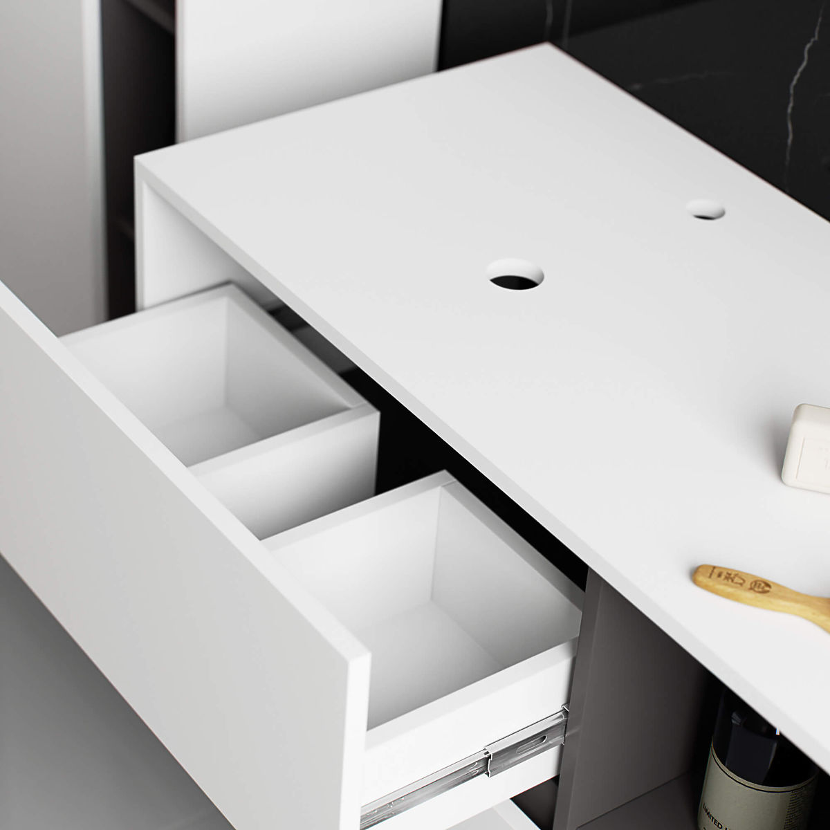 Dulap suspendat pentru baie sub lavoar de 90 cm VAMI W90 se potrivește perfect cu un interior modern. Configurația cu 2 sertare și 2 rafturi deschise oferă un confort mare în utilizare. În sertarele spațioase pot fi depozitate produse de igienă și cosmetice, iar pe rafturile deschise pot fi plasate, de exemplu, decorațiuni care adaugă un caracter personal interiorului. Modelul descris de dulap suspendat sub lavoar are în placă 2 orificii destinate montării lavoarului și sifonului. Dulapul are, de asemenea, sertare special formate care permit instalarea sifonului și a elementelor hidraulice. ATENȚIE! Mobilierul este livrat fără lavoar și fitinguri.