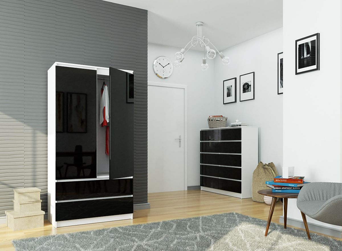 Mobilierul se caracterizează printr-o construcție relativ simplă, dar nu îi poate fi negată funcționalitatea. Partea superioară este compusă din patru rafturi și un loc pentru agățarea hainelor cu o bară special montată, iar partea inferioară are două sertare pe glisiere metalice cu bile GTV. Soluțiile utilizate fac ca dulapul – deși pare ușor – să fie extrem de spațios. În modelul prezentat, combinația a două variante de culori opuse – negru profund și alb brut – conferă întregului set eleganță și un aspect modern, care sunt, de asemenea, subliniate de utilizarea unei suprafețe foarte lucioase.