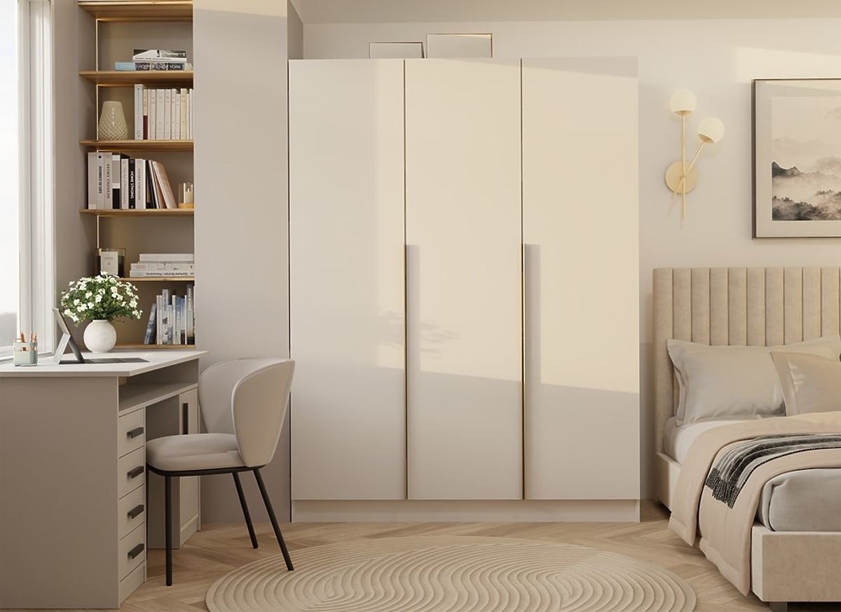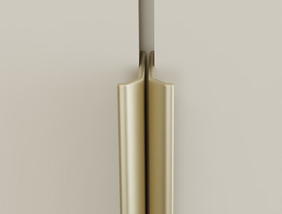 Dacă căutați o combinație de minimalism, eleganță și funcționalitate excepțională, dulapul SENSO 3D este alegerea perfectă. Acest dulap cu trei uși impresionează prin forma sa simplă, finisajul mat în culoarea cașmirului și mânerele aurii caracteristice în nuanța aurului periat, care subliniază caracterul său luxos.