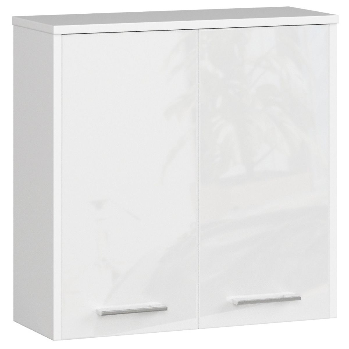 Dulap suspendat pentru baie cu două uși și finisaj alb lucios. .. mai mult