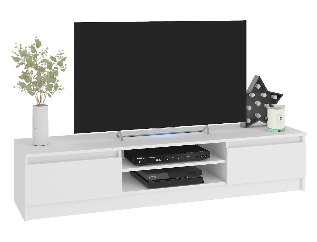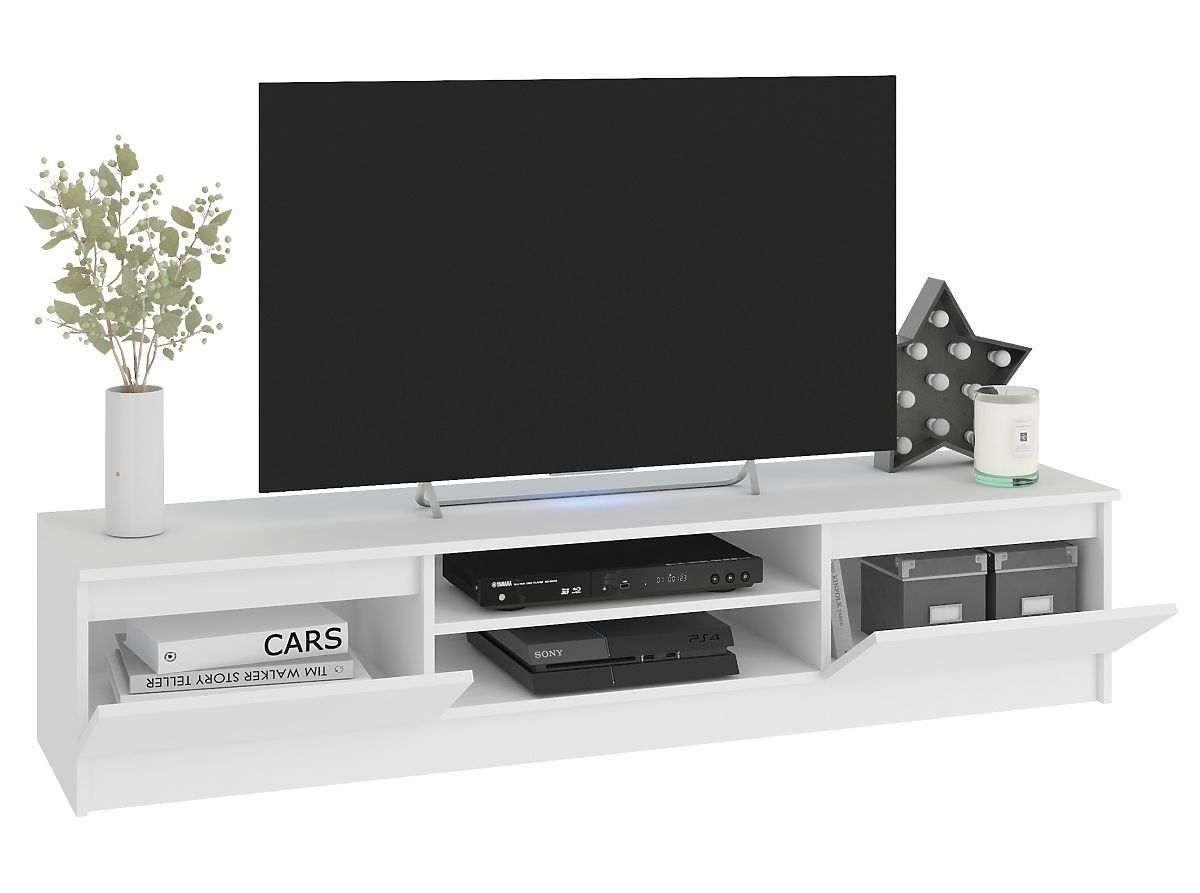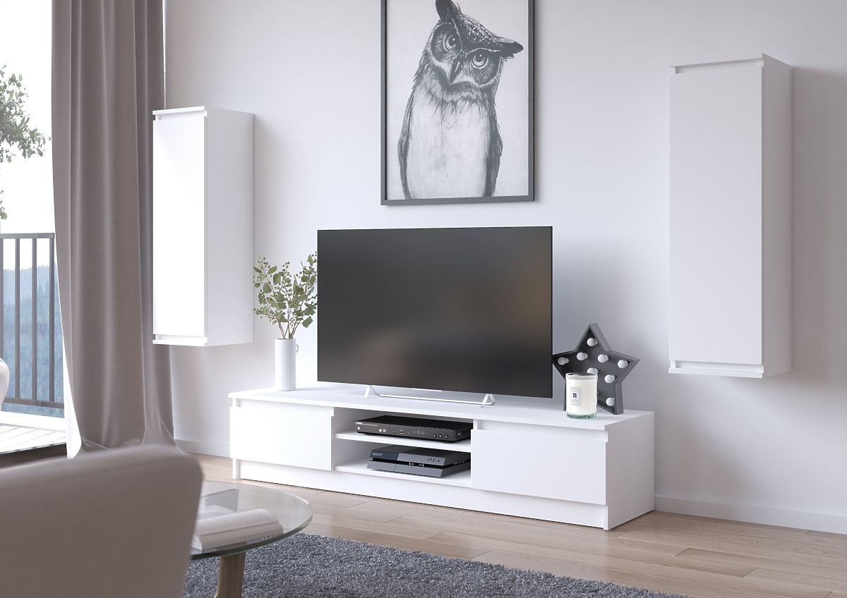 Setul de mobilier, compus dintr-un dulap TV și două dulapuri suspendate, poate fi un echipament funcțional pentru living, birou sau camera de studenți. Dulapul TV are o suprafață mare, pe care se poate plasa un televizor de orice dimensiune și elemente decorative. Mobilierul este echipat cu rafturi practice pentru electronice și spații de depozitare laterale cu uși rabatabile, unde se pot depozita DVD-uri, accesorii pentru computer sau alte mărunțișuri. Masa TV în combinație cu dulapurile suspendate de pe lateralele sale formează o compoziție vizual atrăgătoare. Mobilierul ocupă puțin spațiu, ceea ce îl face potrivit nu doar pentru un living mare, ci și pentru spații mai mici.