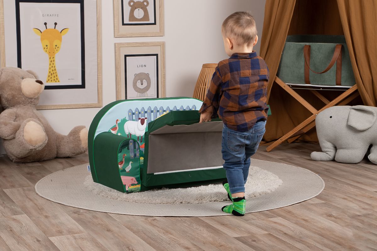 Canapeaua cu motiv vesel de văcuță, oiță, purceluș și alte animale transformă orice cameră de copii într-o mică fermă plină de voie bună. Datorită umpluturii moi din spumă, este ideală pentru joacă în siguranță, relaxare sau citirea cărților preferate. Husa detașabilă din material plăcut și rezistent se întreține ușor, astfel încât copiii să se bucure de confort și părinții de liniște.